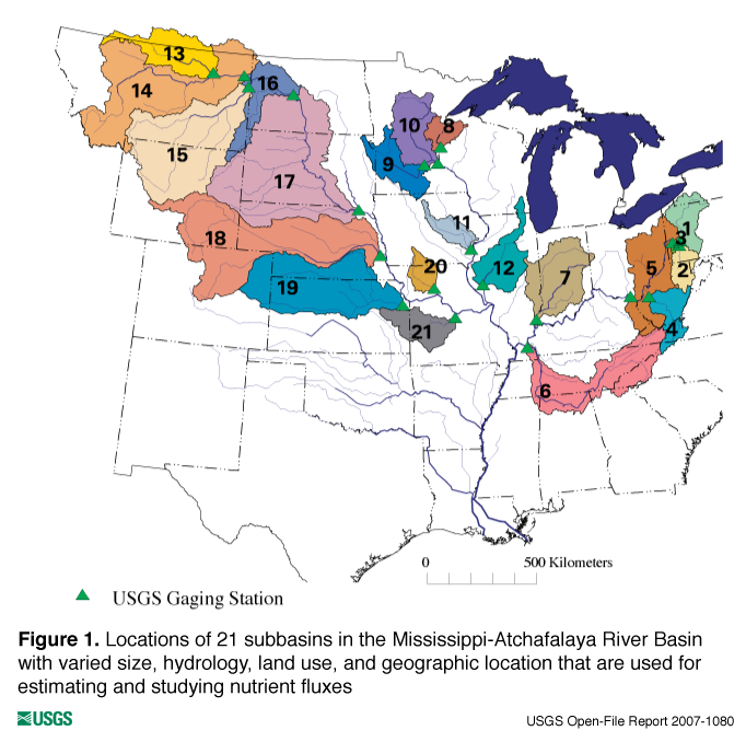 Report Site Map > Monitoring Network for Selected Mississippi-Atchafalaya River Subbasins with Varied Sizes, Hydrology, Land Use, and Geographic Location