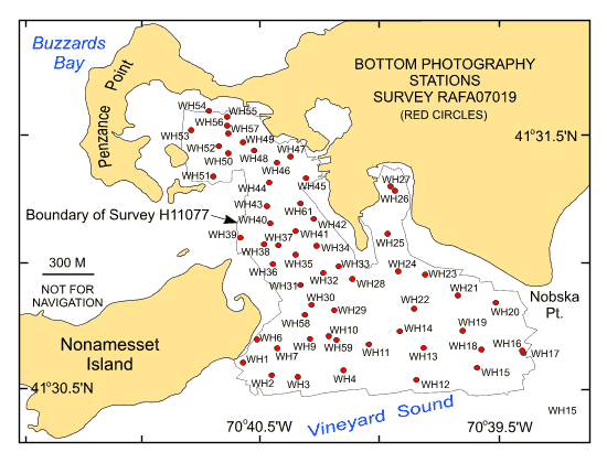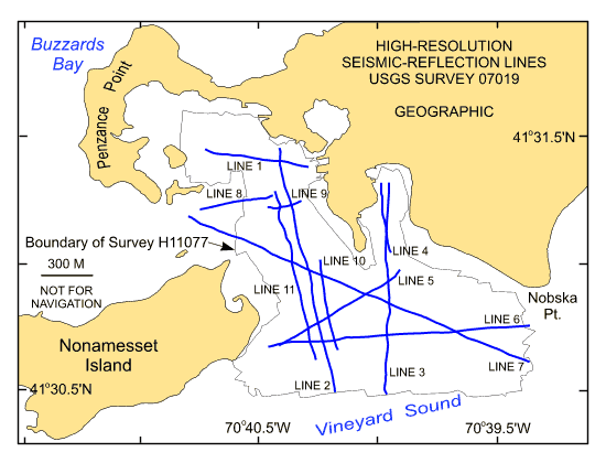 This report contains several data layers (or themes) that can be used to create views of the Woods Hole study area. GeoTIFF files (GeoTIFFs) produced from the NOAA multibeam bathymetric and sidescan-sonar surveys are provided in geographic and Universal Transverse Mercator (Zone 19) projections. GeoTIFFs of the bathymetry are in color and hillshaded; GeoTIFFs of the sidescan imagery are in grayscale. ArcRaster grids of the multibeam bathymetric data, which are provided in 0.5-m and 1.5-m versions, are also provided in geographic and Universal Transverse Mercator projections. Available vector data consist of polygon shapefile data layers that provide the coastline for the Massachusetts Geographic Information System (GIS) project area, an outline of the survey area, and interpretive data layers. Data layers are provided with geographic coordinates to allow the data to be integrated into a GIS. A GIS is defined as a system of hardware and software to support the display, manipulation, and analysis of spatial data for mapping and complex data solving. This integrated package provides researchers the ability to integrate, analyze, and map the various data sets to help with economic and social policy-making decisions regarding the environment. Data layers archived here should not require additional processing to be utilized within the Environmental Systems Research Institute's (ESRI) ArcView and ArcGIS software. This does not mean that a user will not wish to do additional processing, especially if utilizing a different GIS software package or spheroid, but that it is not necessary to do additional processing simply to utilize the data in its minimum archive format. For users who do not have the ESRI software or a compatible GIS data browser available on their computer, a free viewer, ArcExplorer, is available from ESRI here. The key functionality of ArcExplorer is the viewing of spatial data. The user will need to add the selected data layers by using ArcExplorer's add data button. Each GIS data layer from this publication is cataloged below for easy access. The individual data layers are described below and include the GeoTIFF, grid, or shapefile name (for example, h11077_mb0.5m_utm19.tif), which is linked to a browse graphic showing the data-layer extent and coverage. Selecting the data-layer name will cause the browse graphic to be displayed in a separate browser window. When this report is accessed from the DVD-ROM, the top level of the report contains an ArcView project file (h11077.apr) created in ArcView 3.3 and an ESRI ArcMap document (h11077.mxd) created in ArcMap 9.2, but saved as an ArcMap 9.0/9.1 document to make it accessible to older versions of the software. Federal Geographic Data Committee (FGDC) metadata for the individual data layers are provided in HTML, FAQ html, and text versions. Selecting associated metadata files from the table below will cause the information to appear in a new browser window. A "zip" compressed, downloadable archive file containing the components of the ArcView shapefile for each data layer is also provided. Compressed downloadable files were created using the Windows program WINZIP v8.0. For those users who do not have software capable of uncompressing the archived zip files, a free version of the software can be obtained from Winzip Computing, Inc., or Pkware, Inc. MULTIBEAM BATHYMETRIC IMAGERY