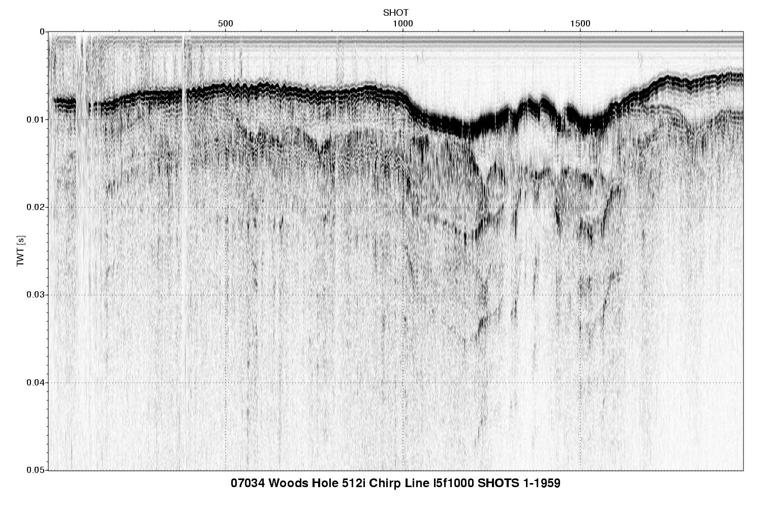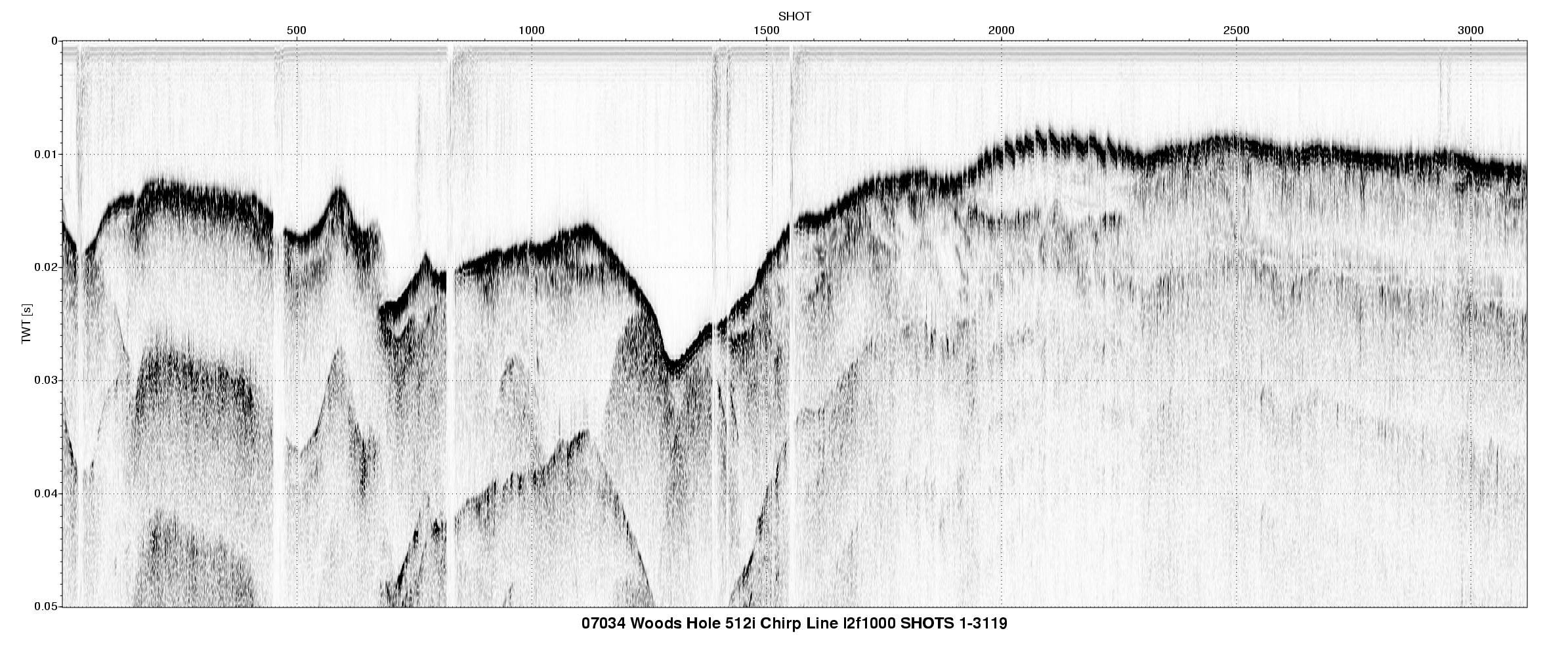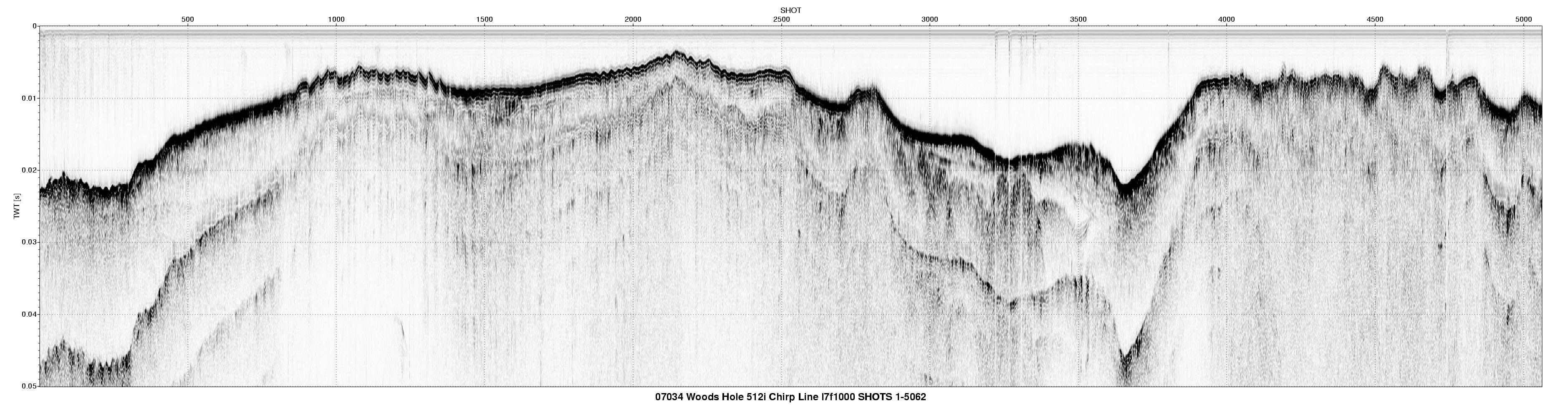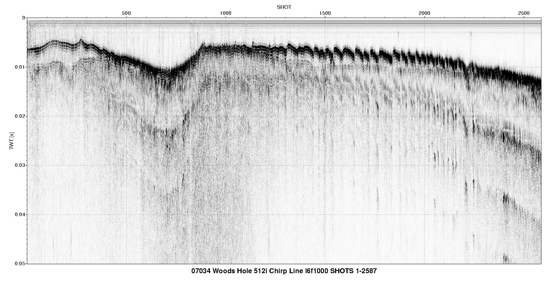 The seismic profiles acquired during the 2007 Research Vessel Rafael cruise RAFA07034 (fig. 11) provide insights into the stratigraphic framework and Quaternary geologic history of the Woods Hole sea floor. Three sedimentary units are inferred from the subbottom profiles: glacial moraine deposits of Pleistocene age, glaciolacustrine deposits of late Pleistocene age, and transitional and marine deposits of Holocene age. Although not resolved by our shallow high-resolution seismics, these deposits overlie a bedrock surface reported to be composed of gray to pink granodiorite at approximately 85 m below sea level (Hallett and others, 2004). Unstratified drift of the Buzzards Bay moraine, which underlies most of the study area, has an irregular, abrupt upper surface that forms an acoustic basement (fig. 29). Scattered on the moraine surface are many small (1-2 m) elevations interpreted to be boulders, and several large, relatively steep-sided, isolated depressions. A seismic facies characterized by finely laminated, rhythmic, parallel internal reflectors that drape the underlying topography can be seen within some of the depressions (fig. 29). On the basis of their seismic character, we interpret these deposits to be varved, muddy glaciolacustrine sediments. Intense tidal scour has restricted the deposition of modern marine sediments across much of the study area. Where present, these sediments are relatively thin or generally limited to more protected areas, such as the inner parts of Great and Little Harbors. Exceptions include the shoals located both east and west of Great Ledge. If compressional-wave velocities for unconsolidated sand are assumed to be 1600-1700 m/s, the Holocene sediments that comprise the shoal overlying the glacial and transitional deposits west of Great Ledge have an average thickness of 5.0 to 6.6 m (figs. 30, 31). However, the Holocene section in the shoal east of Great Ledge averages only about 2.5 m thick. The seismic signal in the inner part of Little Harbor is attenuated within small patches by the presence of gas (fig. 32). This gas is probably biogenic methane released from marsh or organic-rich estuarine deposits that are now buried by modern marine sediment. The seismic profiles collected during cruise RAFA07034 (fig. 11) can be accessed through the tabular data listing below. To view the seismic-reflection profiles through the data listing, click on the name of the preview image to display a down-sampled 'GIF' image of that seismic line. The image will be displayed in a new browser window. All preview images have been reduced to 72 dpi and a maximum width of 650 pixels for optimum viewing with a Web browser. Because the original size of the preview images varied, the images do not have the same scale. To access a full-resolution image of a seismic profile in ‘JPEG' format or the seismic data in 'SEG-Y' format, the user is advised to download the desired file, exit their browser, and open the file in an appropriate application (such as Corel Draw or Adobe Illustrator for a JPEG file). Instructions for downloading the full-resolution images follow the data listing.