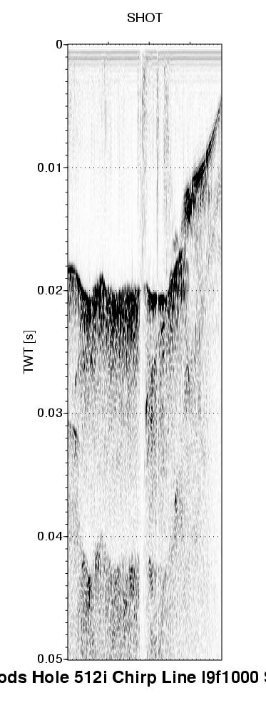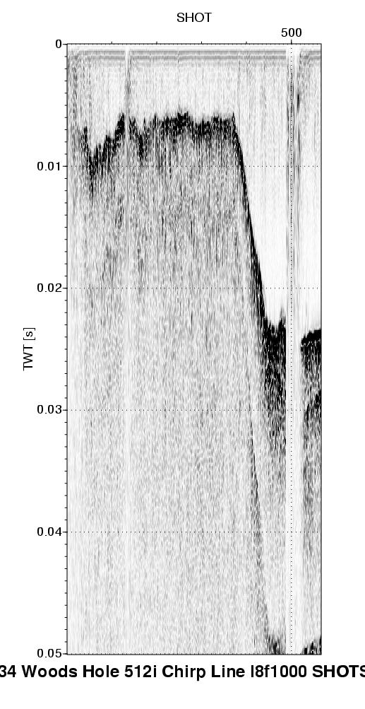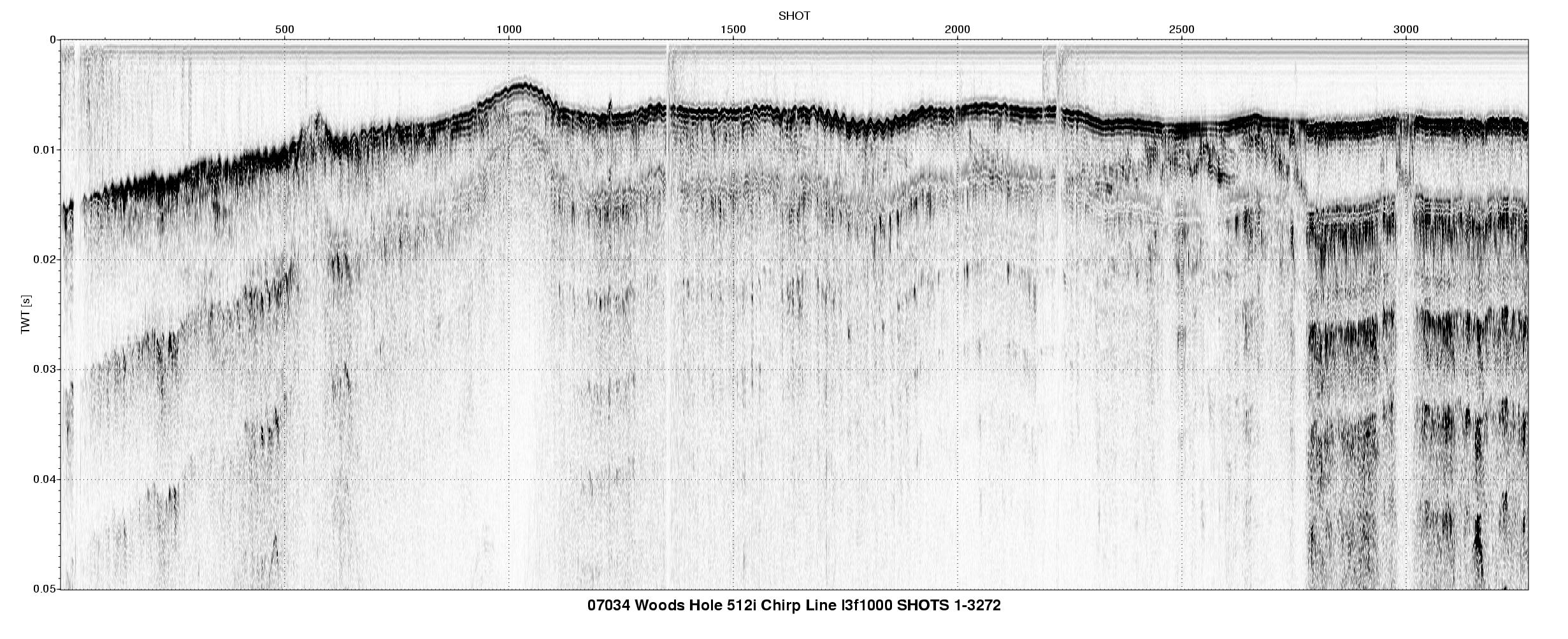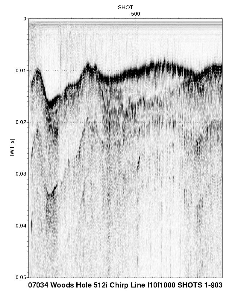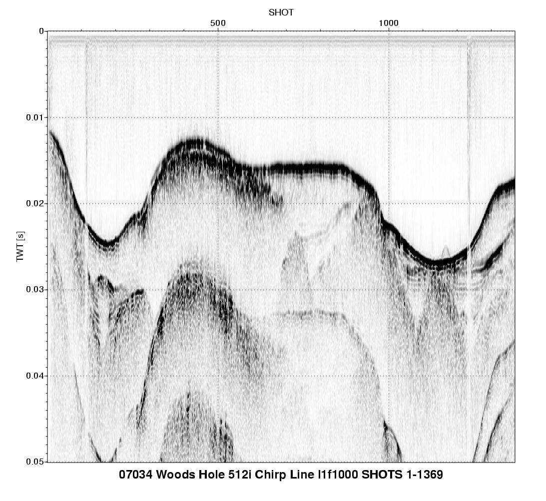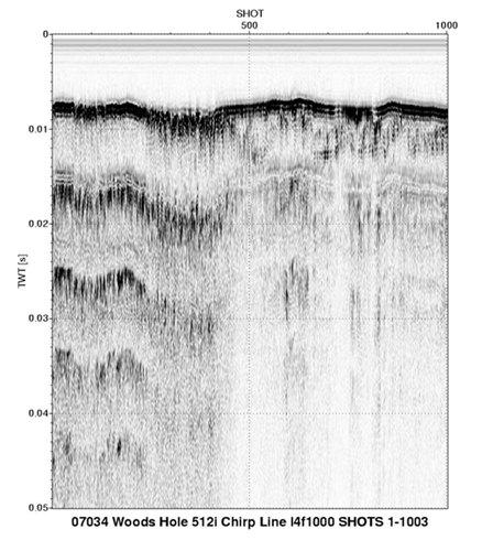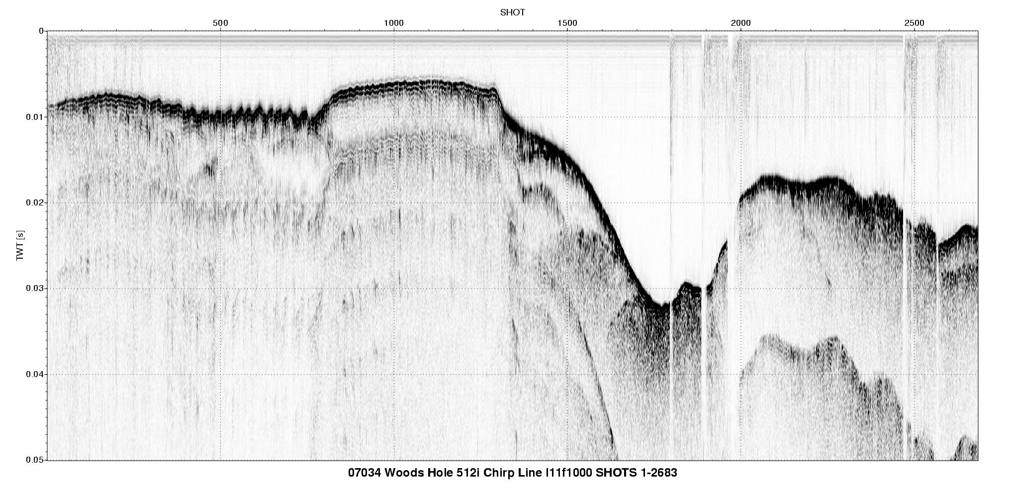 The seismic profiles acquired during the 2007 Research Vessel Rafael cruise RAFA07034 (fig. 11) provide insights into the stratigraphic framework and Quaternary geologic history of the Woods Hole sea floor. Three sedimentary units are inferred from the subbottom profiles: glacial moraine deposits of Pleistocene age, glaciolacustrine deposits of late Pleistocene age, and transitional and marine deposits of Holocene age. Although not resolved by our shallow high-resolution seismics, these deposits overlie a bedrock surface reported to be composed of gray to pink granodiorite at approximately 85 m below sea level (Hallett and others, 2004). Unstratified drift of the Buzzards Bay moraine, which underlies most of the study area, has an irregular, abrupt upper surface that forms an acoustic basement (fig. 29). Scattered on the moraine surface are many small (1-2 m) elevations interpreted to be boulders, and several large, relatively steep-sided, isolated depressions. A seismic facies characterized by finely laminated, rhythmic, parallel internal reflectors that drape the underlying topography can be seen within some of the depressions (fig. 29). On the basis of their seismic character, we interpret these deposits to be varved, muddy glaciolacustrine sediments. Intense tidal scour has restricted the deposition of modern marine sediments across much of the study area. Where present, these sediments are relatively thin or generally limited to more protected areas, such as the inner parts of Great and Little Harbors. Exceptions include the shoals located both east and west of Great Ledge. If compressional-wave velocities for unconsolidated sand are assumed to be 1600-1700 m/s, the Holocene sediments that comprise the shoal overlying the glacial and transitional deposits west of Great Ledge have an average thickness of 5.0 to 6.6 m (figs. 30, 31). However, the Holocene section in the shoal east of Great Ledge averages only about 2.5 m thick. The seismic signal in the inner part of Little Harbor is attenuated within small patches by the presence of gas (fig. 32). This gas is probably biogenic methane released from marsh or organic-rich estuarine deposits that are now buried by modern marine sediment. The seismic profiles collected during cruise RAFA07034 (fig. 11) can be accessed through the tabular data listing below. To view the seismic-reflection profiles through the data listing, click on the name of the preview image to display a down-sampled 'GIF' image of that seismic line. The image will be displayed in a new browser window. All preview images have been reduced to 72 dpi and a maximum width of 650 pixels for optimum viewing with a Web browser. Because the original size of the preview images varied, the images do not have the same scale. To access a full-resolution image of a seismic profile in ‘JPEG' format or the seismic data in 'SEG-Y' format, the user is advised to download the desired file, exit their browser, and open the file in an appropriate application (such as Corel Draw or Adobe Illustrator for a JPEG file). Instructions for downloading the full-resolution images follow the data listing.