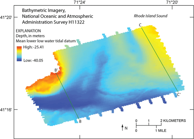 Figure 6. Bathymetric image of National Oceanic and Atmospheric Administration survey H11322 in western Rhode Island Sound. Bathymetric highs are located in the northwest, northeast, and southwest. Channels lie between the northern bathymetric highs and across their southern boundaries. Green lines indicate locations of seismic-reflection profiles B-B' and C-C', shown in figures 7 and 8, respectively. | ||