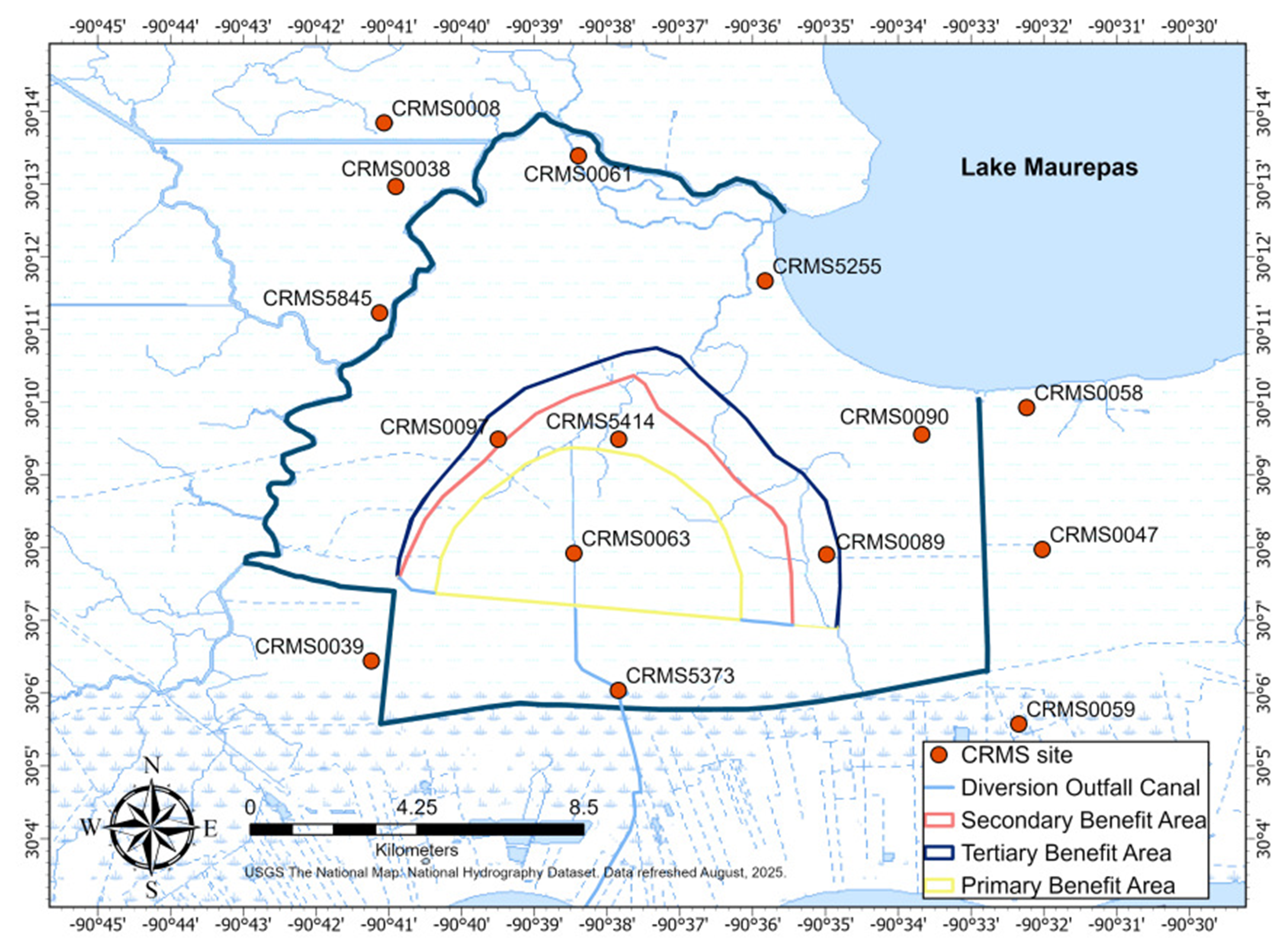 Coastal Protection and Restoration Authority (CPRA) of Louisiana (2025) Coastwide Reference Monitoring System-Wetlands Monitoring Data. Retrieved from Coastal Information Management System (CIMS) database. http://cims.coastal.louisiana.gov.