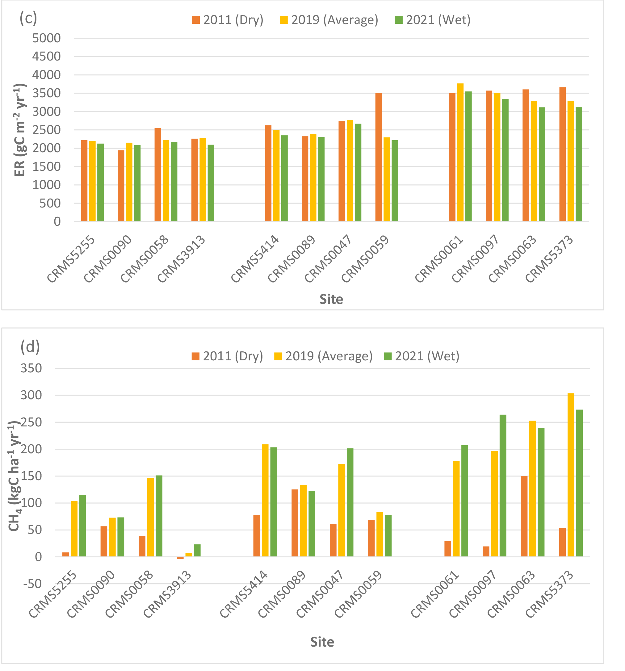 Compared to the average year, NEE decreased significantly at 10 out of the 12 sites (except increased at CRMS0090 and CRMS0061) by an average of -26.2% (range: -9.7 to -83.6%, standard deviation (sd): 21%) in the simulated dry year whereas NEE increased at all 12 sites by an average of 20.6% (range: 14.2 to 33%, sd: 5.6%) in the simulated wet year (Table 3, Fig. 4a). NPP changed little in the dry year (i.e., decreased at 6 sites with an average of -0.8% and increased for the remaining 6 sites by an average of 3%); whereas NPP increased at all sites with an average of 16.4% (range: 12.3 to 23.1%, sd: 3.1%) in the wet year (Table 3, Fig. 4b). ER increased at 7 sites with an average of 14% (range: 1.5 to 53%, sd: 16.6%) in the dry year, and ER decreased at the remaining sites with an average of -4.4% (range: 0.7 to 9.8%, sd: 3.5%) also in the dry year (Fig. 4c). In contrast, ER decreased consistently across sites with an average of -4.5% (range: -2.5 to -8%, sd: 1.5%) in the wet year (Table 3, Fig. 4c). Across all the sites, NEE was reduced in the dry year mainly due to the general increase in ER, but NEE was enhanced in the wet year due to both increased NPP and reduced ER.