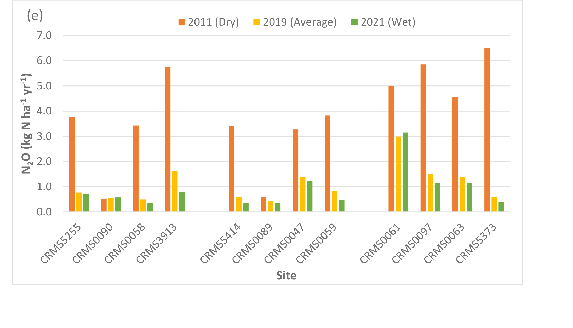 Compared to the average year, CH4 emissions decreased significantly (p < 0.0001) at all sites with an average of -66% (range: -6 to -158%, sd: 39.8%) in the dry year (Fig. 4d). CH4 emissions generally increased by 26% (sd: 70,6%) across sites in the wet year, with the highest increase (256%) at CRMS3913, a degraded swamp forest site located near the south rim of Lake Maurepas (Fig. 1, Table 4, Fig. 4d). A slight decrease in CH4 emissions (-6.5%, range: -2.5 to -10%, sd: 2.5%) was also found in the wet year at the throughput and relict sites, suggesting a bi-directional trend of CH4 emissions under inundation. Unlike CH4, substantial increases in N2O emissions (average: 350.6%, range: 41-1,006%, sd: 262.4%) were found at all but one site (CRMS0090, -4.7%) in the dry year; whereas N2O emissions generally decreased across sites (except CRMS0061 and CRMS0090) by an average of -27% (range: 5.7 to -50.5%) in the wet year (Table 4, Fig. 4e).