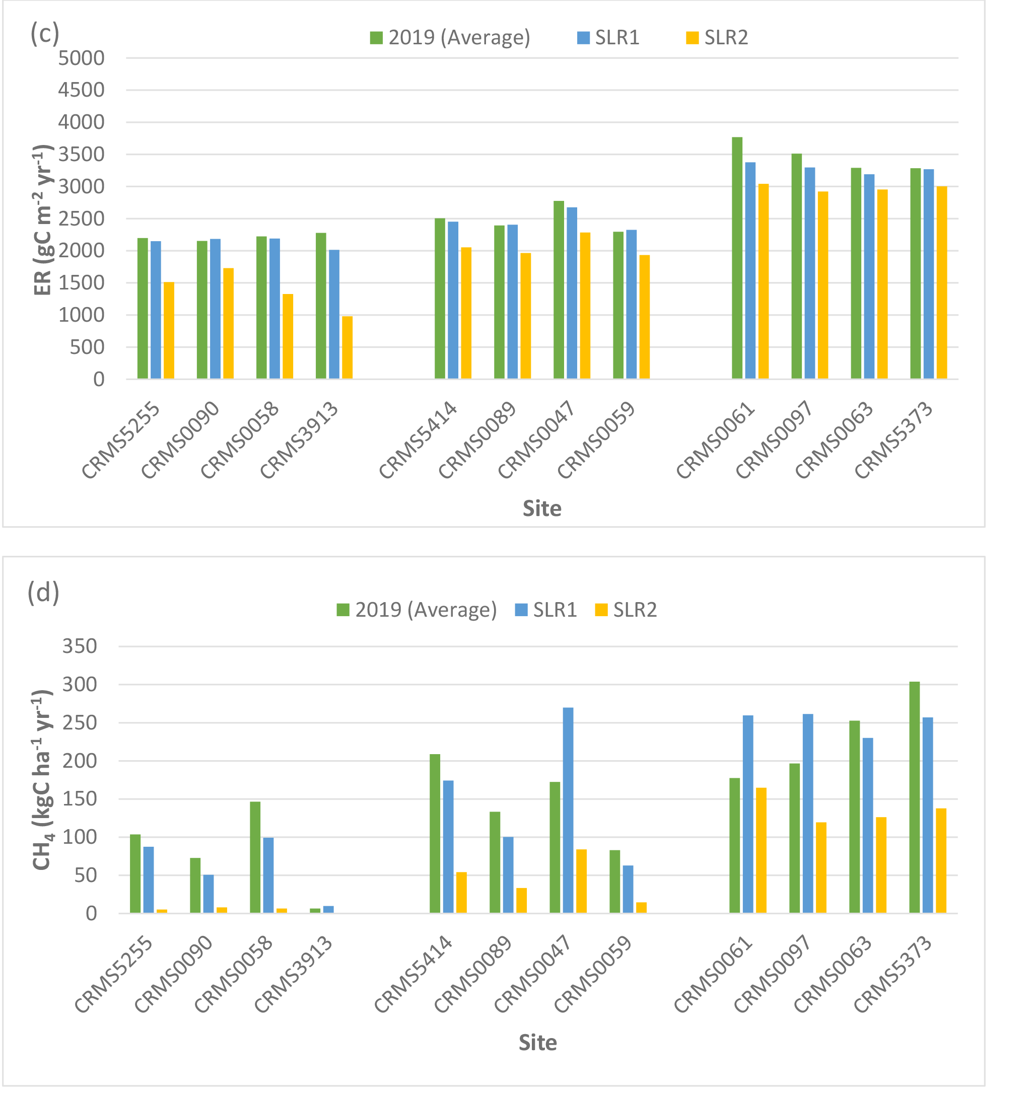 Two-way ANOVA tests of SLR scenarios showed that there were significant “scenario” (p < 0.0001) and “site × scenario” effects (p < 0.05) for NEE, NPP, ER, CH4 fluxes, and N2O fluxes, indicating that rising sea level and associated increase in salinity especially the high SLR scenario would affect carbon fluxes across the Lake Maurepas swamp forests. Simulated NEE showed that high SLR (SLR2: +0.5m, salinity = 3x dry year’s salinity) significantly reduced the capability of the swamp forests to maintain their sink capacity for atmospheric CO2 in the degraded and relict sites (averaged reduction by -29% ranging from -14 to -56%), but high SLR enhanced the carbon sink capacity in throughput sites (by an average of 14.3% ranging from approximate 2 – 36%) compared to the average year without increases in sea level and salinity (Table 3, Fig. 5). NPP increased at the throughput sites under both SLR scenarios (average: 7%, range: 0.2 to 12%) but declined at the degraded and relict sites (e.g. -58% decrease at CRMS3913) under the high SLR scenario (Table 3, Fig. 5). ER generally decreased at all sites especially under the high SLR scenario by -22.7% (range: -9 to -57%, sd: 13.2%) compared to the low SLR (SLR1) scenario by -3.2% (range: -0.5 to -12%, sd: 4.1%, Table 3, Fig. 5).