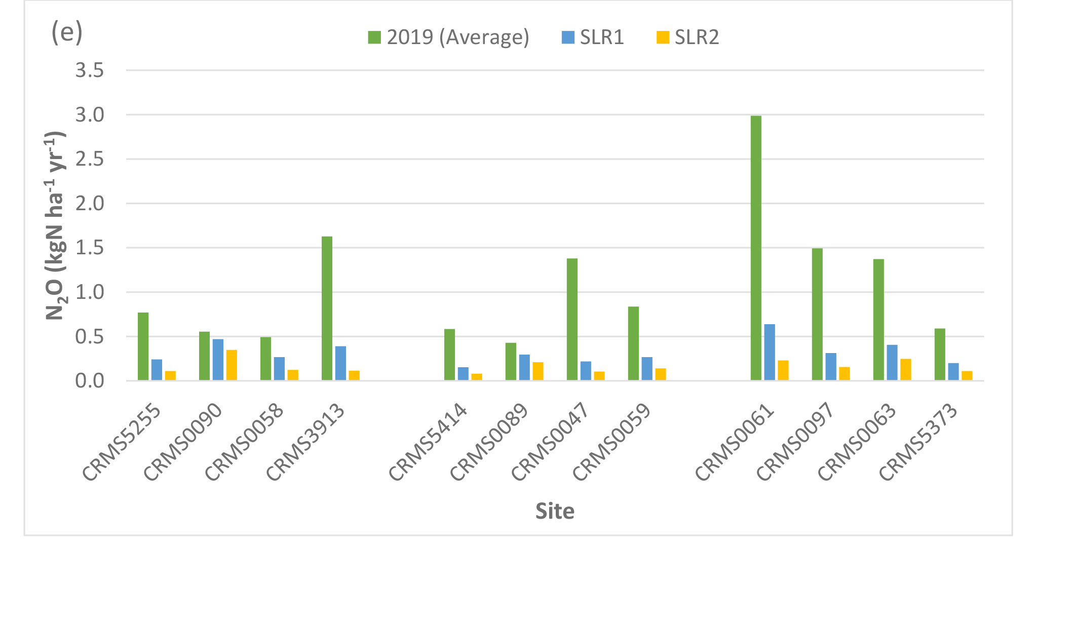 CH4 emissions decreased at all sites under the high SLR scenario by -68% (range: -7 to -100%, sd: 26.7%); whereas CH4 emissions either increased under the low SLR scenario by 33 – 56% or decreased by -9 to -32% depending on site (Table 4, Fig. 5). In contrast to CH4, N2O emissions decreased by an average of -71% (range: -15 to -93%) at all sites under both SLR scenarios (Table 4, Fig. 5). Overall, compared to the average year, site-averaged NEE and NPP increased (average: 10.5% and 3.9%; sd: 13.3% and 5.9%) under the low SLR scenario, indicating greater net carbon uptake, but decreased (average: -15% and -19%; sd: 25% and 19%) under the high SLR scenario, indicating less net carbon uptake (Table 3, Fig. 5). ER and N2O emissions declined (average: -3.2% and -63%; sd: 4.1% and 20.4%) under the low SLR scenario and decreased even more (average: -22.7% and -79%; sd: 13.2% and 16.7%) under the high SLR scenario; CH4 emissions slightly increased (< 1.6%; sd: 33%) under the low SLR but decreased substantially (-68%; sd: 26.7%) under the high SLR scenario (Tables 3, 4, Fig. 5).