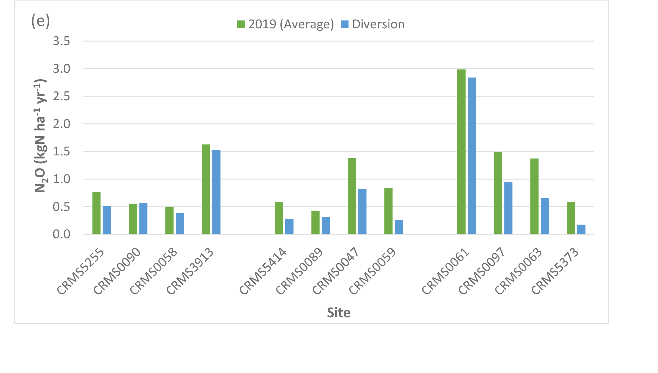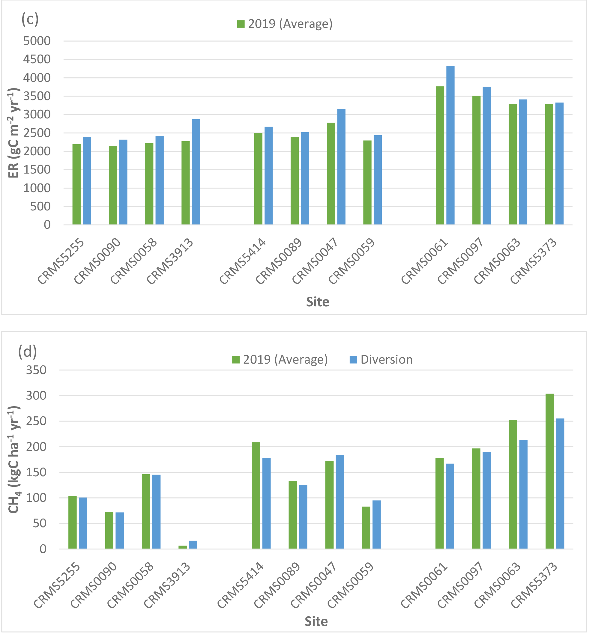 CH4 emissions decreased at 9 out of the 12 sites under the river diversion (average: -7.5%, range: -1 to -16%, sd: 5.9%) but increased at the remaining 3 sites (average: 56.8%, range: 6.7 to 149%, sd: 65.4%, Table 4, Fig. 6d). Highest increases in CH4 emissions (149%) with river diversion occurred at CRMS3913, a degraded site near the lake. Unlike CH4, N2O emissions declined by an average of -34% (range: -5.0 to -70.5%, sd: 21.2%) across 11 of our 12 sites (increased by 2.8% at CRMS0090) (Fig. 6e). Overall, site-averaged NEE, NPP, ER, and CH4 fluxes with the river diversion scenario indicated greater carbon uptake by +2.5%, +13.5%, +9.2%, and +8.6%, respectively, and reduced N2O uptake by -34%.