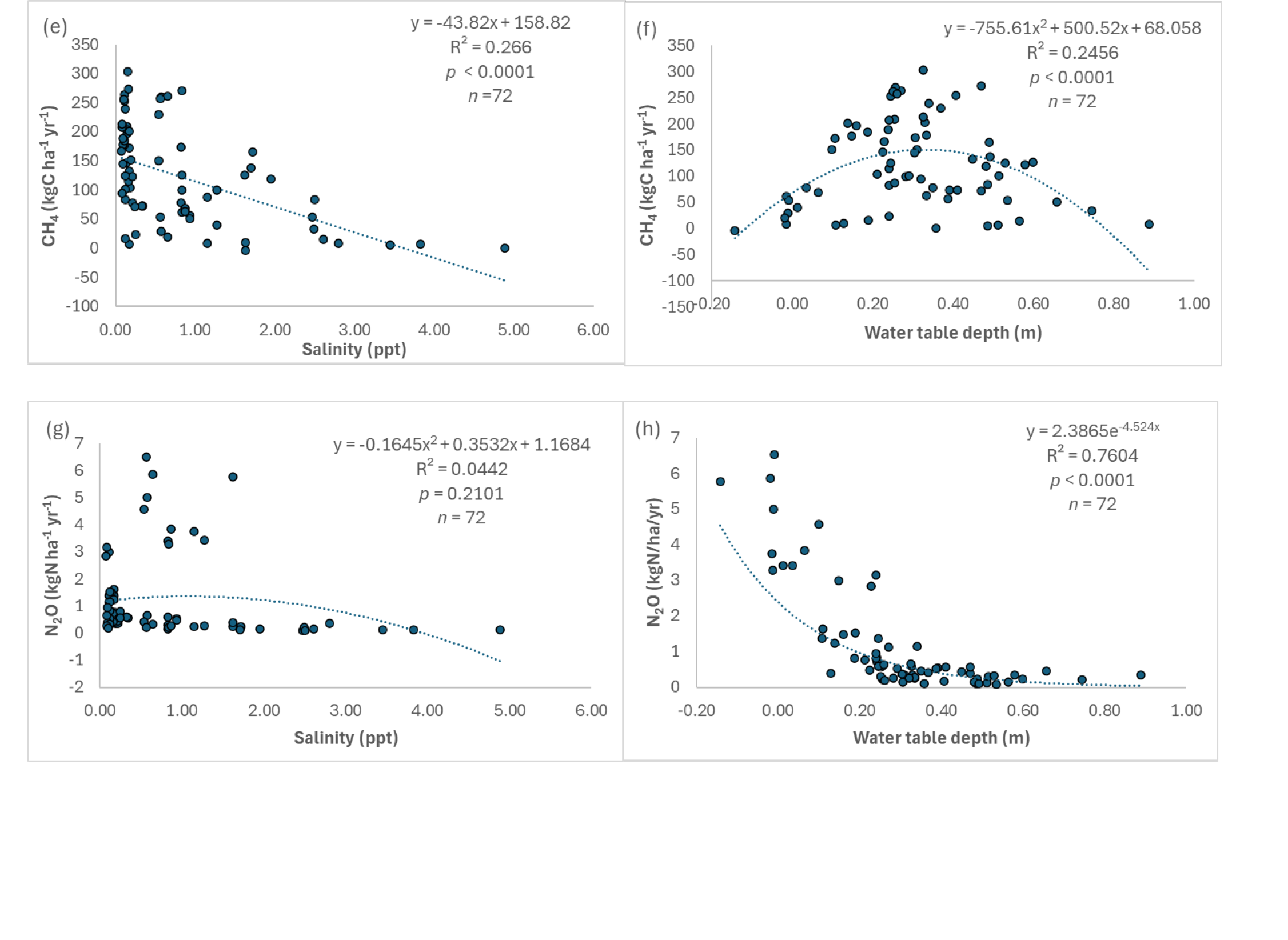 We found significant inverse relationships between soil salinity and NPP, ER, and CH4 emissions (p < 0.0001; Figs. 7a, c, e), but not for N2O emissions (p = 0.2101; Fig. 7g), suggesting that soil salinity would reduce NPP and ER, and inhibit CH4 emissions in the Lake Maurepas swamp forests. In contrast, there was a weak relationship between water table depth and NPP (p = 0.2482; Fig. 7b), but significant inverse relationship between water table depth and ER (p = 0.001; Fig. 7d), polynomial relationship between water table depth and CH4 emissions (p < 0.0001; Fig. 7f), and exponential relationship between water table depth and N2O emissions (p < 0.0001; Fig. 7h). As water table depth increased, ER and N2O decreased. Maximum CH4 emissions occurred at 20 – 30 cm above the soil surface, and N2O emissions were exponentially reduced with water table depth in the range of 20 cm below the soil surface and 20 cm above the soil surface. In summary, NPP was inversely affected much more by soil salinity than soil water level, ER and CH4 emissions tended to be affected by both salinity and soil water level, and N2O emissions were largely affected by soil water level rather than soil salinity for the Lake Maurepas swamp forests.