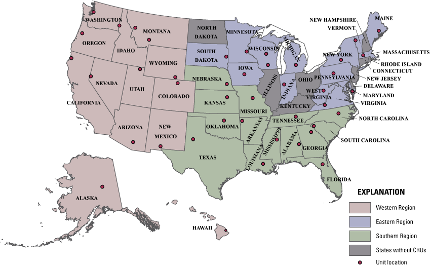 In fiscal year 2024 (FY 2024), there were 43 CRUs located in 41 States at 44 host universities (fig. 1). The national CRU program office is embedded within the Ecosystems mission area at the USGS headquarters in Reston, Virginia. The 43 units are subdivided into three regions, each with its own supervisor.