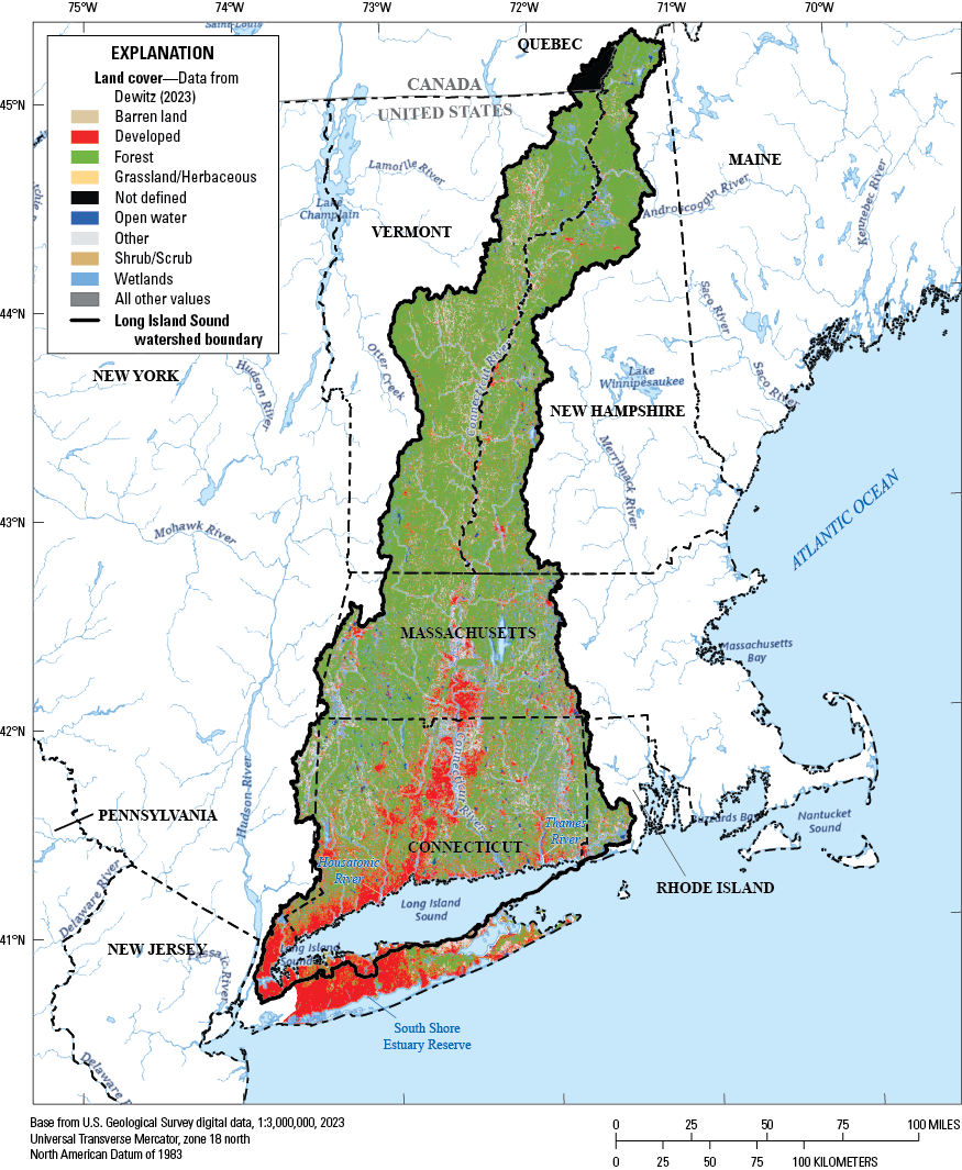 The Long Island Sound is a tidal estuary in the northeastern United States. It has an area of 1,194 square miles, drains about 17,000 square miles, ranges from freshwater to saltwater, and encompasses almost 600 miles of shoreline (Long Island Sound Study, 2024). Several major rivers contribute to the sound, including the Connecticut, Housatonic, and Thames Rivers. These rivers and their tributaries make up most of the Long Island Sound watershed, or the area of land from which water drains into the sound. The watershed spans parts of Connecticut, Massachusetts, New Hampshire, New York, Rhode Island, and Vermont in the United States and Quebec in Canada that are populated by nearly 9 million people (Long Island Sound Study, 2024; Parker, 2024). Land use in the Long Island Sound watershed includes urban areas along the Connecticut River and the coast of the Long Island Sound and mostly forested and agricultural areas in western Massachusetts, New Hampshire, and Vermont (fig. 1). Land use can greatly affect the quality and quantity of stormwater runoff, groundwater recharge, flooding, and overall ecosystem health, making it an important factor within the watershed.