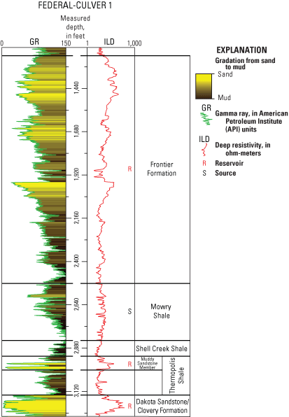 Type log image of the Federal-Culver 1 well (S24, T28N, R92W), which highlights the stratigraphy of the Mowry Composite Total Petroleum System.