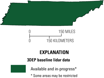 Map of Tennessee showing status of 3D Elevation Program (3DEP) baseline lidar data as of January 2025. Visit https://usgs.gov/NationalMap/LidarExplorer to find and download currently available data.