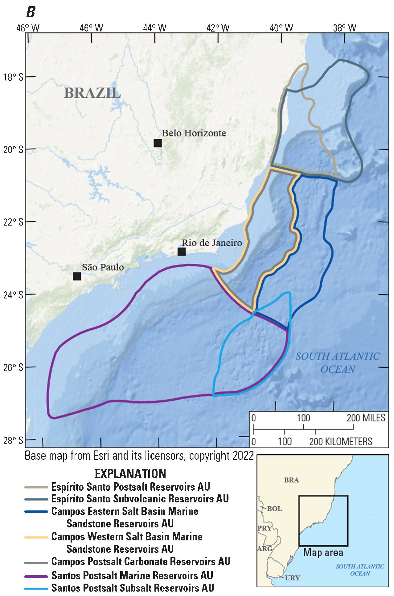 The U.S. Geological Survey (USGS) assessed the potential for undiscovered, technically recoverable conventional oil and gas resources in the Santos Basin, Campos Basin, and Espírito Santo Basin provinces of Brazil (fig. 1A, B). These three offshore geologic provinces along the eastern margin of South America share a similar tectonic evolution, which is briefly summarized as follows for this report (Davison, 2007; Contreras and others, 2010; Beglinger, Doust, and Cloetingh, 2012; Beglinger, Wees, and others, 2012; Alves and others, 2017; Amarante and others, 2020). In the Late Jurassic, Gondwana began to fragment because of mantle hotspot activity, and by the Early Cretaceous, rifts formed as South America began to separate from Africa. From the Berriasian to Barremian, synrift lacustrine-fluvial to deep-lacustrine sandstones and organic-rich lacustrine mudstones accumulated in the rifts. As extension and rifting waned in the early Aptian, postrift thermal subsidence formed a sag basin in which a spectrum of lacustrine carbonate reservoir rocks, mudstones, and minor sandstones were deposited. Topographic relief on the Florianopolis Fracture Zone formed a volcanic sill immediately south of the Santos Basin that was periodically crossed by marine waters. Evaporation in the silled basin led to as much as 2,000 meters (m) of salt and anhydrite from the late Aptian Ariri Formation. Shortly after deposition, differential loading produced by postsalt deposition caused the salt to deform, forming diapirs, rollers, turtles, and other salt structures that affected the distribution, trapping, and sealing of postsalt carbonate and clastic reservoirs. Seafloor spreading and the continued opening of the South Atlantic Ocean in the early Albian led to the inundation of the evaporite basin by normal marine waters and the formation of extensive carbonate platforms. Transgression in the Late Cretaceous led to drowning of the carbonate platforms, deposition of Cenomanian to Turonian organic-rich source rocks, and progradation of clastic sequences shed from the Serra do Mar. Several phases of uplift from the Late Cretaceous to the Miocene, possibly related to mantle hotspot activity, led to the progradation of several clastic sequences. These sequences comprise fluvial, deltaic, shelf, and slope to deep-marine sandstones and mudstones and are important postsalt reservoirs in the three provinces. The Paleogene emplacement of volcanic rocks of the Abrolhos Bank in the eastern Espírito Santo Basin may have covered presalt and postsalt source rocks, reservoir rocks, and traps (Estrella and others, 1984).