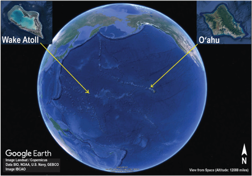 Wake Atoll (generally referred to hereafter as “Wake”) is part of the Gilbert-Marshall Island chain in the Pacific Ocean, about 3,500 kilometers (km) west of the Hawaiian Islands, 2,600 km east of Guam, 3,200 km southeast of Japan, and 570 km north of Bokak Atoll in the Republic of the Marshall Islands (Bryan, 1959; U.S. Air Force, unpub. data, 2017). Wake is one of the most isolated terrestrial islands in the Pacific (fig. A1; U.S. Air Force, unpub. data, 2017). Wake consists of three islets: (1) Peale, (2) Wake, and (3) Wilkes, arranged in a V-shaped pattern around a central lagoon (fig. A2; Bryan, 1959). Wake is a low atoll with an average elevation of about 4 meters (m), maximum elevation of about 6.4 m above sea level, and a total land area of about 7 square kilometers (km2; U.S. Air Force, unpub. data, 2008). The climate is tropical maritime with little annual temperature variation (U.S. Air Force, unpub. data, 2008). Mean annual temperatures range from 24.4 to 28.3 degrees Celsius (°C), with an annual maximum of 35 °C and a minimum of 20 °C. Rainfall averages about 890 millimeters (mm) per year (Weatherbase, 2020). Together, high temperatures and low rainfall generally keep Wake in a state of drought (U.S. Air Force, unpub. data, 2008). Frequent tropical storms and typhoons generating high winds and waves can cause considerable damage to vegetation and infrastructure (U.S. Air Force, unpub. data, 2008). Wake consists of porous coral rubble and limestone with organic matter in vegetated areas (U.S. Air Force, unpub. data, 2008). Despite low endemism and biodiversity in general, Wake and other atolls protect various natural resources, including several terrestrial and marine natural resources, such as plants, seabirds, shorebirds, lizards, and sea turtles (Engilis and Naughton, 2004; U.S. Fish and Wildlife Service, 2005; Thaman, 2016).
