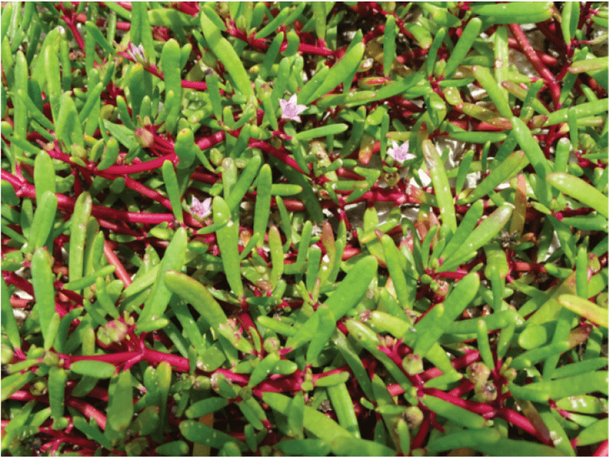 Sesuvium portulacastrum, a succulent herb that forms dense mats around the edges of brackish wetlands on Wake and Peale Islets. (Photograph by J. Jacobi, U.S. Geological Survey, 2019).