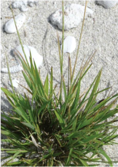 The native grass, Lepturus repens, is detected in the strand vegetation on Wake Atoll and in more inland sites, particularly on Peale Islet, where it forms a dense grass cover under an open Heliotropium foertherianum woodland. (Photograph by J. Jacobi, U.S. Geological Survey, 2019).