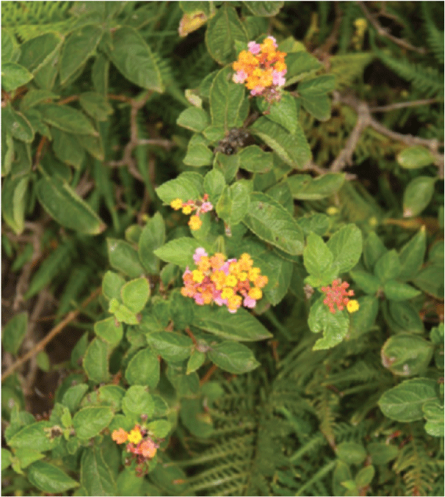 Lantana camara is a small woody shrub that has been able to dominate lowland dry and mesic habitats in Pacific Island ecosystems, such as those in Hawai‘i. (Photograph by J. Jacobi, U.S. Geological Survey, 2019).