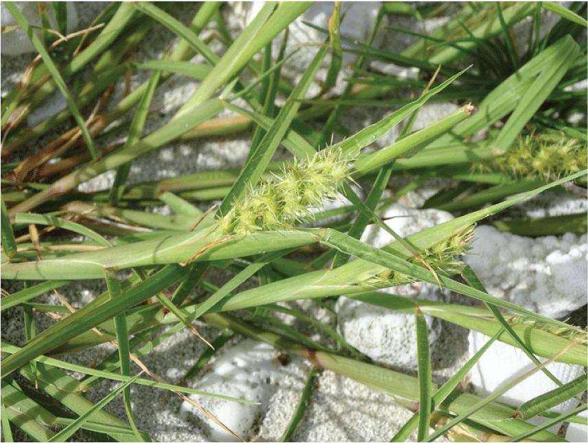 The introduced sandbur grass (Cenchrus echinatus) is becoming established in many sites on Wake and Peale Islets. (Photograph by J. Jacobi, U.S. Geological Survey, 2019).