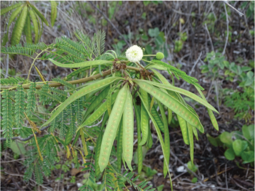 Flowers, immature seed pods, and foliage of the introduced invasive tree Leucaena leucocephala, which is becoming established in several locations on Wake and Peale Islets. (Photograph by J. Jacobi, U.S. Geological Survey, 2019).