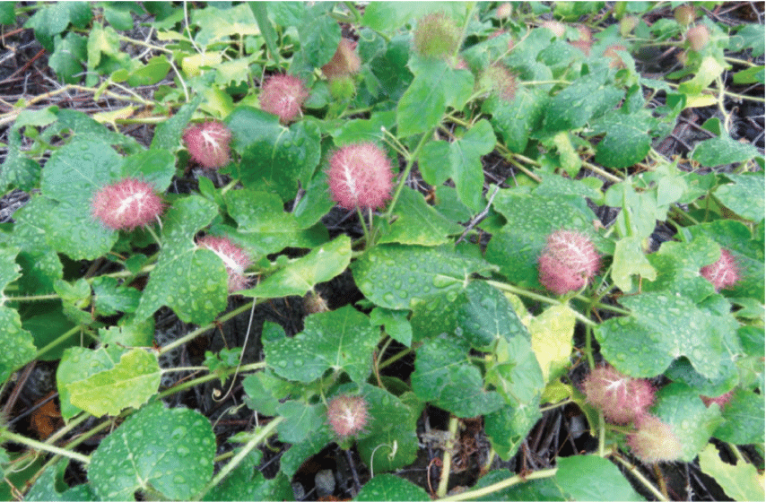 The introduced vine Passiflora foetida var. hispida is currently (2019) detected on Wake Islet and the southeastern part of Wilkes Islet just north of the harbor inlet and storage tanks. (Photograph by John Gilardi, Island Conservation, 2018).