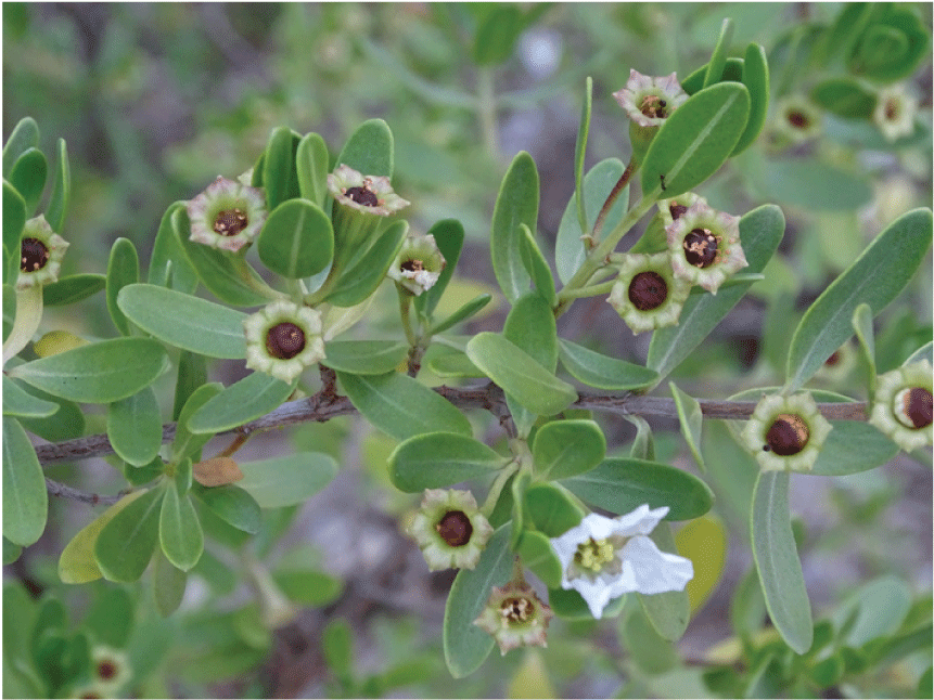 Flowers and immature fruit of Pemphis acidula, which forms a dense shrub community, particularly around the lagoon sides of Wake, Wilkes, and Peale Islets. (Photograph by J. Jacobi, U.S. Geological Survey, 2019).