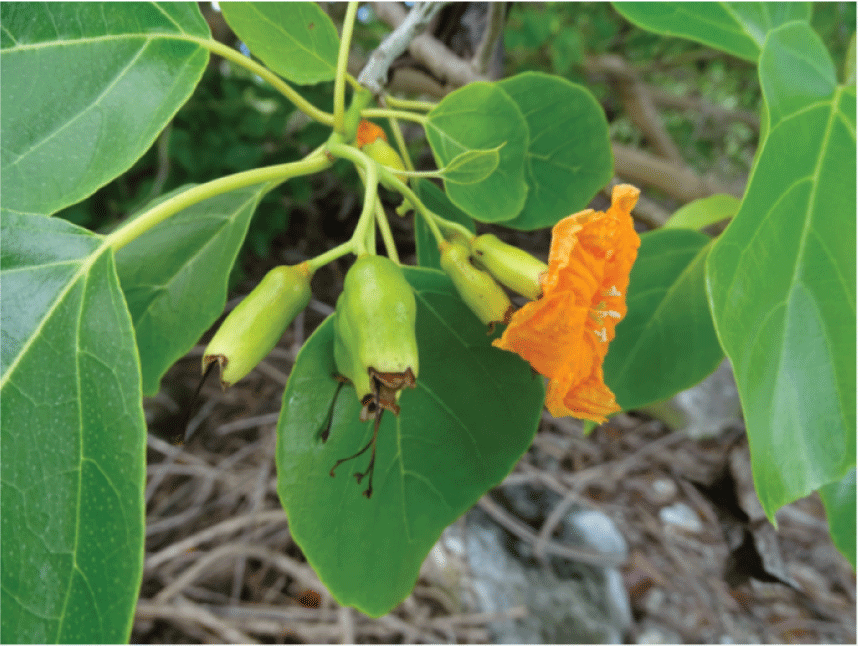 Flower of the tree Cordia subcordata, which grows in a mixed woodland-shrub community with Heliotropium foertherianum and Pisonia grandis on Wake Atoll. (Photograph by J. Jacobi, U.S. Geological Survey, 2019).