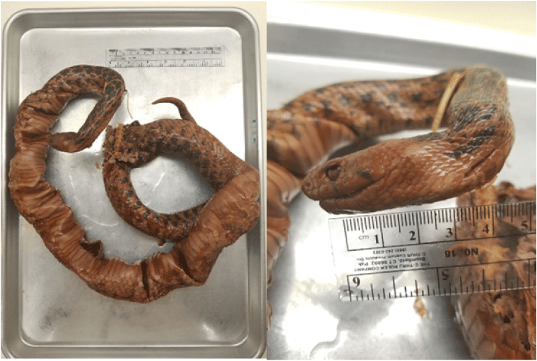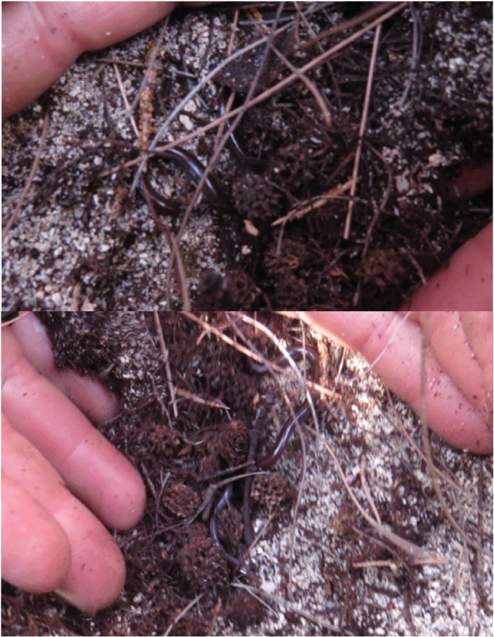 Brahminy blindsnakes (Ramphotyphlops braminus; table D1; fig. D9; appendix D3) are not native to Wake. We did not see any Brahminy blindsnakes during these surveys; however, we received photograph documentation of this species on Peale Islet in 2017 from John Gilardi of Island Conservation (fig. D9). The original museum record had been collected on Wake Islet in 1998. The Brahminy blindsnake is potentially localized on Wake and Peale; however, this cryptic fossorial species is mostly nocturnal and generally detected by moving soil, leaf litter, rocks and debris, or occasionally on the surface during rains. The species resembles an earthworm, so it is often overlooked.