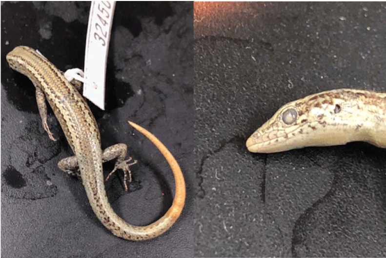 Oceania snake-eyed skink (Cryptoblepharus poecilopleurus) specimen from Wake Atoll identified in the museum record as a metallic skink (Lygosoma metallicum). (Photographs by Brigham Young University Life Science Museum, 2019).