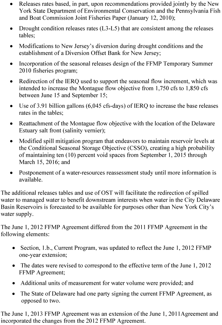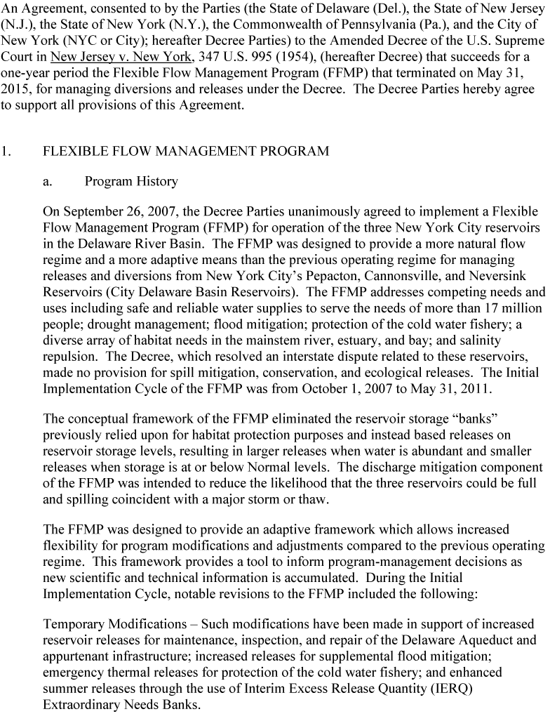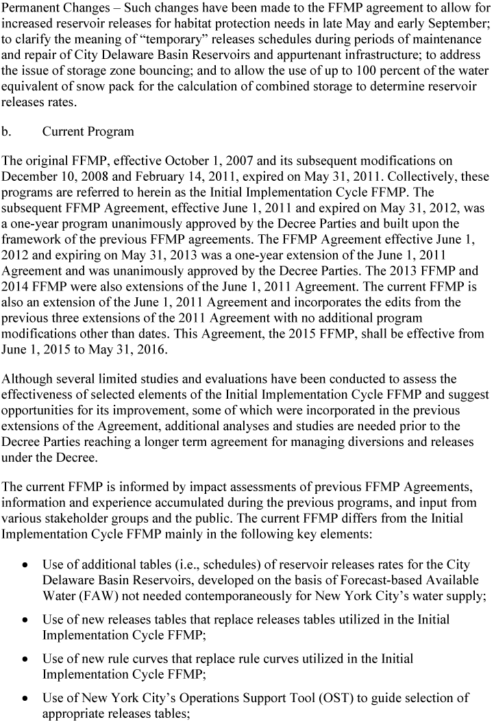 Since 2007, the Decree Parties (Delaware, New Jersey, New York, New York City, and Pennsylvania) have unanimously approved a series of Flexible Flow Management Program (FFMP) agreements (available at https://webapps.usgs.gov/odrm/ffmp/flexible-flow-management-program) to manage the shared waters of the Delaware River Basin (appendix 1). The 2014 FFMP and 2015 FFMP were in effect during the 2015 River Master report year: “The current FFMP is also an extension of the June 1, 2011, Agreement and incorporates the edits from the previous three extensions of the 2011 Agreement with no additional program modifications other than dates. This Agreement, the 2015 FFMP, shall be effective from June 1, 2015, to May 31, 2016.” (appendix 1; also available at https://webapps.usgs.gov/odrm/documents/ffmp/FFMP_2015_Agreement1.pdf).