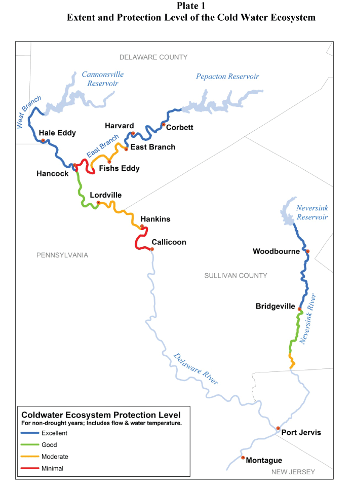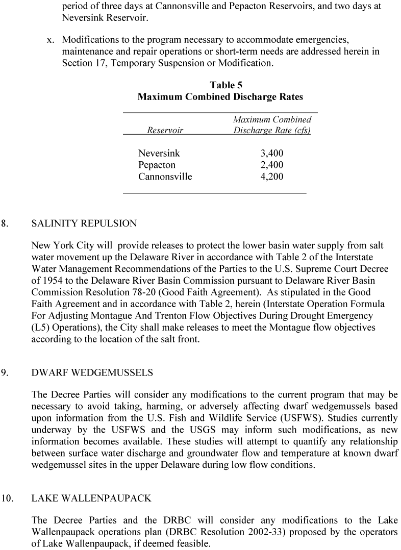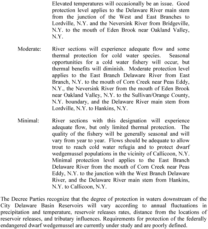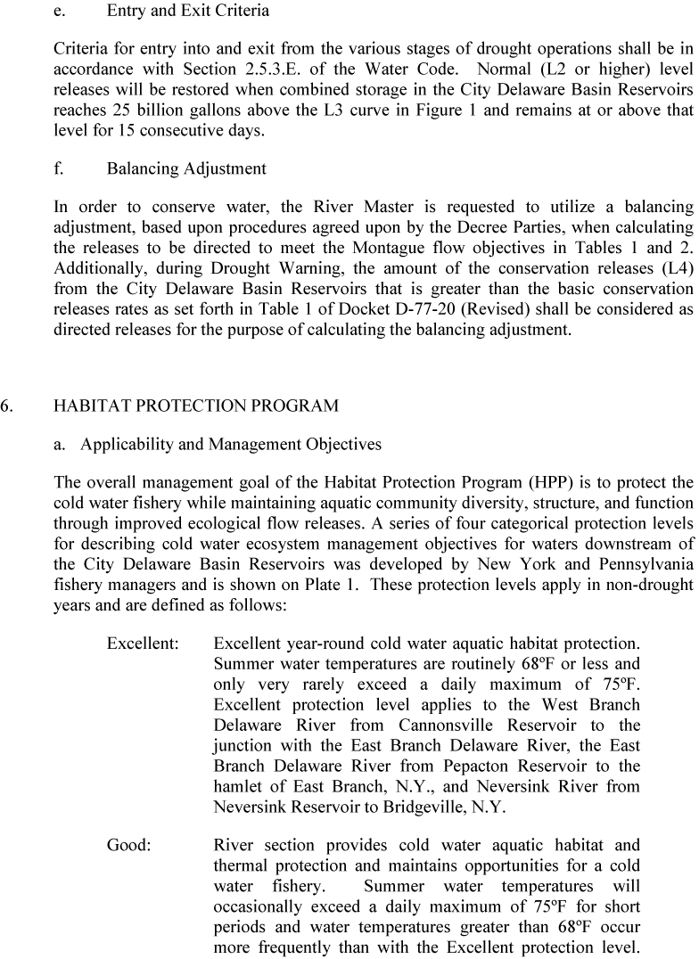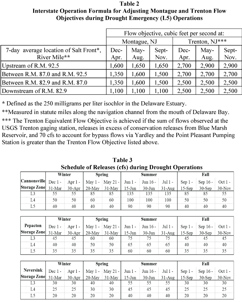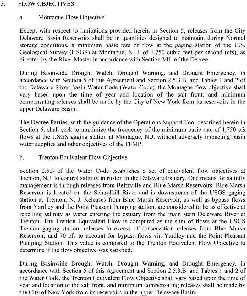 In section 3b of the June 1, 2015, Flexible Flow Management Program (appendix 1), “Section 2.5.3 of the Water Code establishes a set of equivalent flow objectives at Trenton, N.J. to control salinity intrusion in the Delaware Estuary. During Basinwide Drought Watch, Drought Warning, and Drought Emergency, in accordance with Section 5 of this Agreement and Section 2.5.3.B. [sic] and Tables 1 and 2 of the Water Code, the Trenton Equivalent Flow Objective shall vary based upon the time of year and location of the salt front, and minimum compensating releases shall be made by the City of New York from its reservoirs in the upper Delaware Basin.” The Delaware River Basin Water Code regulations are found in the Code of Federal Regulations (18 CFR part 410).