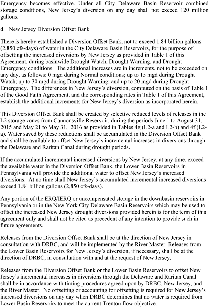 The Decree authorizes New Jersey to divert water from the Delaware River and its tributaries in New Jersey to areas outside of the Delaware River Basin without compensating releases. Under the FFMP, New Jersey diversions shall not exceed 100 Mgal/d as a monthly average, and the daily mean diversion shall not exceed 120 Mgal/d. When the lower part of the Delaware River Basin is in a drought warning period, diversions shall not exceed 85 Mgal/d as a running average.