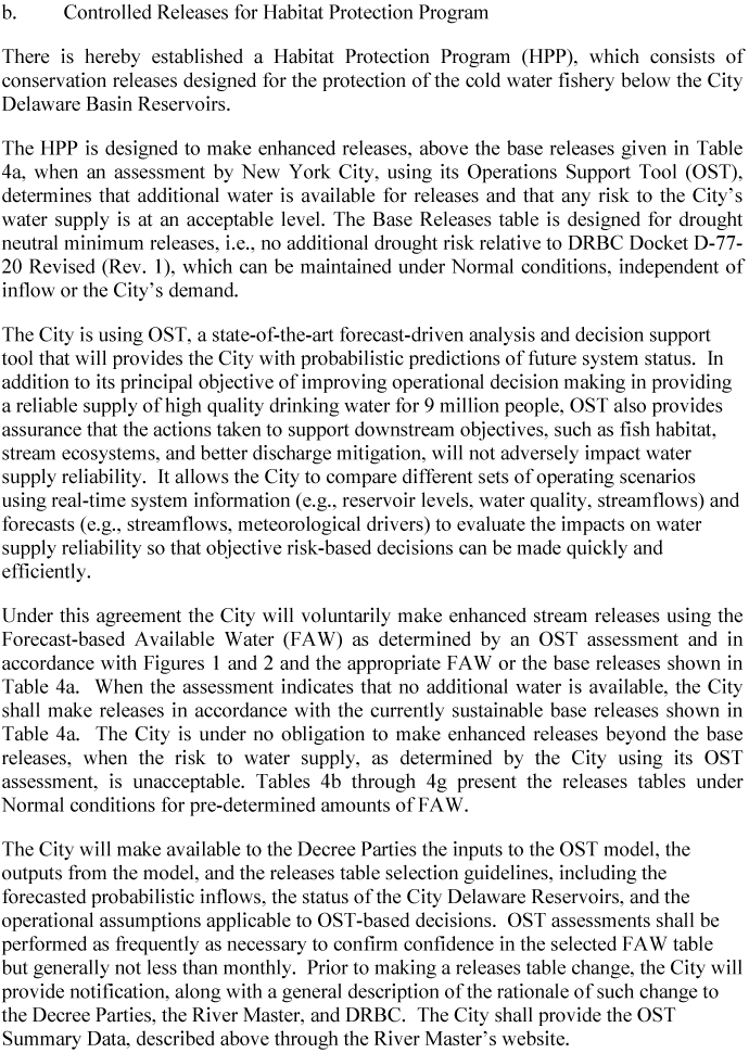 Diversions from the Delaware River Basin by New York City and New Jersey fully complied with the Decree. The reservoir releases were made as directed by the River Master at rates designed to meet the flow objective for the Delaware River at Montague, New Jersey, on 72 days during the report year. Interim Excess Release Quantity and conservation releases, designed to relieve thermal stress and protect the fishery and aquatic habitat in the tailwaters of the reservoirs, were also made during the report year.
