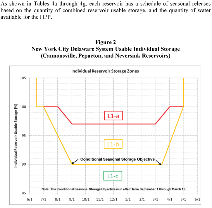 Table 2 summarizes the “point of maximum depletion” and other pertinent levels and the contents of the Pepacton, Cannonsville, and Neversink Reservoirs. The NYCDEP provided this information.