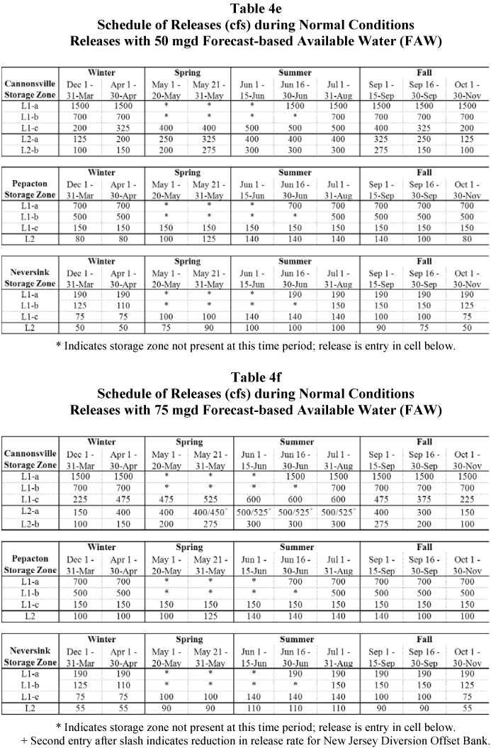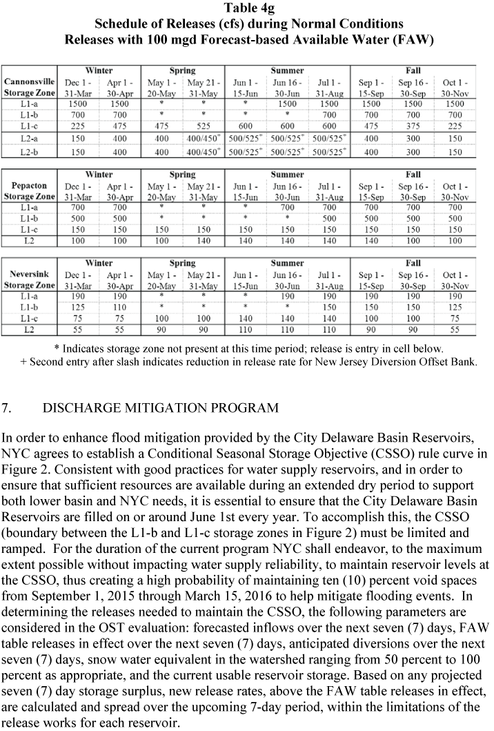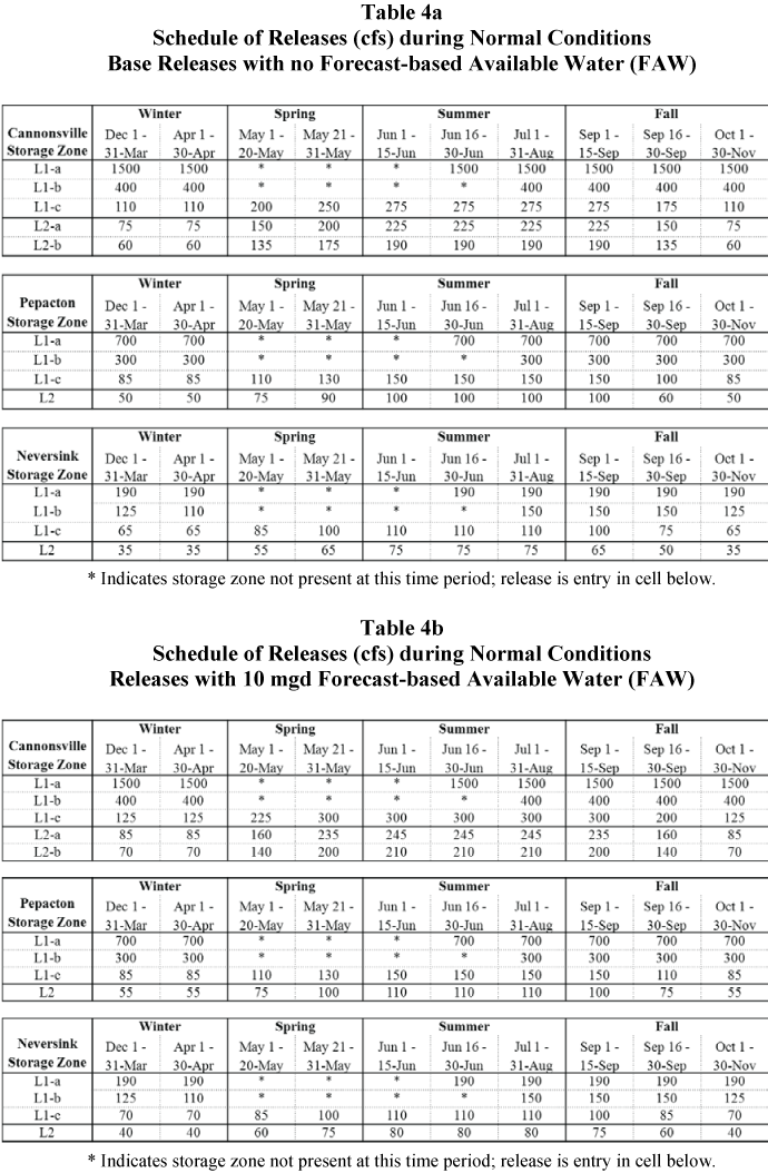 Conservation releases from the New York City reservoirs were made at the rates shown in 2014 FFMP tables 4a–g (https://webapps.usgs.gov/odrm/ffmp/FFMP_2014_Agreement.pdf) and the June 1, 2015, FFMP (appendix 1), including table 4e of both FFMPs in December, table 4d in mid-January, table 4a in late January, table 4f in mid-February, table 4g in late February, table 4a in early March–May, table 4b in early June, table 4e in mid-June, tables 4f and 4g in late June–August, table 4g in September, and tables 4f and 4g in October–November 2015 (see “Archived OST [Operational Support Tool] Summary Data” at https://webapps.usgs.gov/odrm/data/data.html).