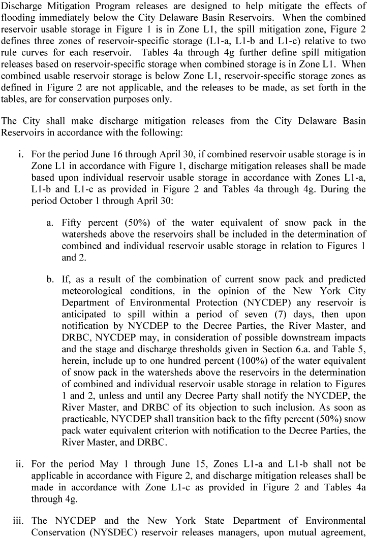 During this period, an additional agreement was signed to temporarily modify storage calculations related to a drought watch. As part of that agreement, one-half of the snow-water-equivalent was added to the actual combined storage in the New York City reservoirs to determine when storage conditions were assessed to enter zone L3 from March 13 through April 15, 2015 (appendix 2; also available at https://webapps.usgs.gov/odrm/documents/ffmp/2015_Temporary_Modification.pdf).