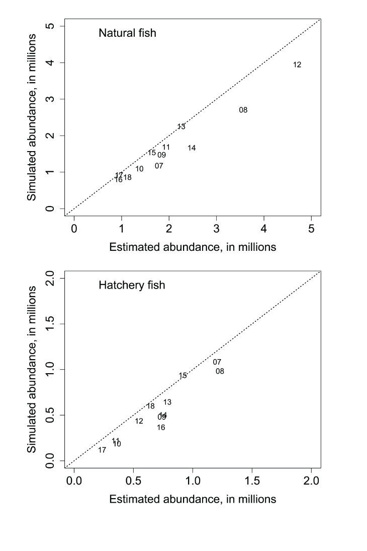 Estimated annual abundance of natural (top) and hatchery (bottom) juvenile Chinook salmon (Oncorhynchus tshawytscha) passing the Pear Tree fish trap, Trinity River, California, plotted against their corresponding Stream Salmonid Simulator simulated annual abundances. Data points represent the last two digits of the migration year.