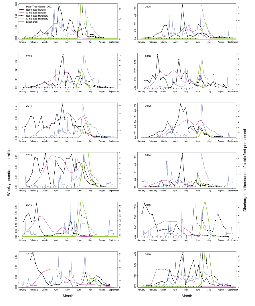 Time series of estimated weekly abundances and the Stream Salmonid Simulator simulated weekly abundances of juvenile hatchery and natural Chinook salmon (Oncorhynchus tshawytscha) passing the Pear Tree fish trap each migration year in the Trinity River, California. Also shown is the daily Trinity River discharge (blue line).
