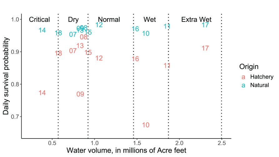 We assessed trends in annual hatchery and natural fish survival, movement, and consumption parameters with spawner abundance and the total annual water volume for the Trinity River. To quantify trends in the parameters, we used linear regression applied to hatchery and natural fish survival and movement parameters as the response variables and used spawner abundance and total annual water volume as the predictor variables. We did not compare hatchery fish survival and movement parameters to the number of spawners. Because Cy was estimated jointly between hatchery and natural fish, we do not contrast results or regressions of Cy between hatchery and natural fish sources.