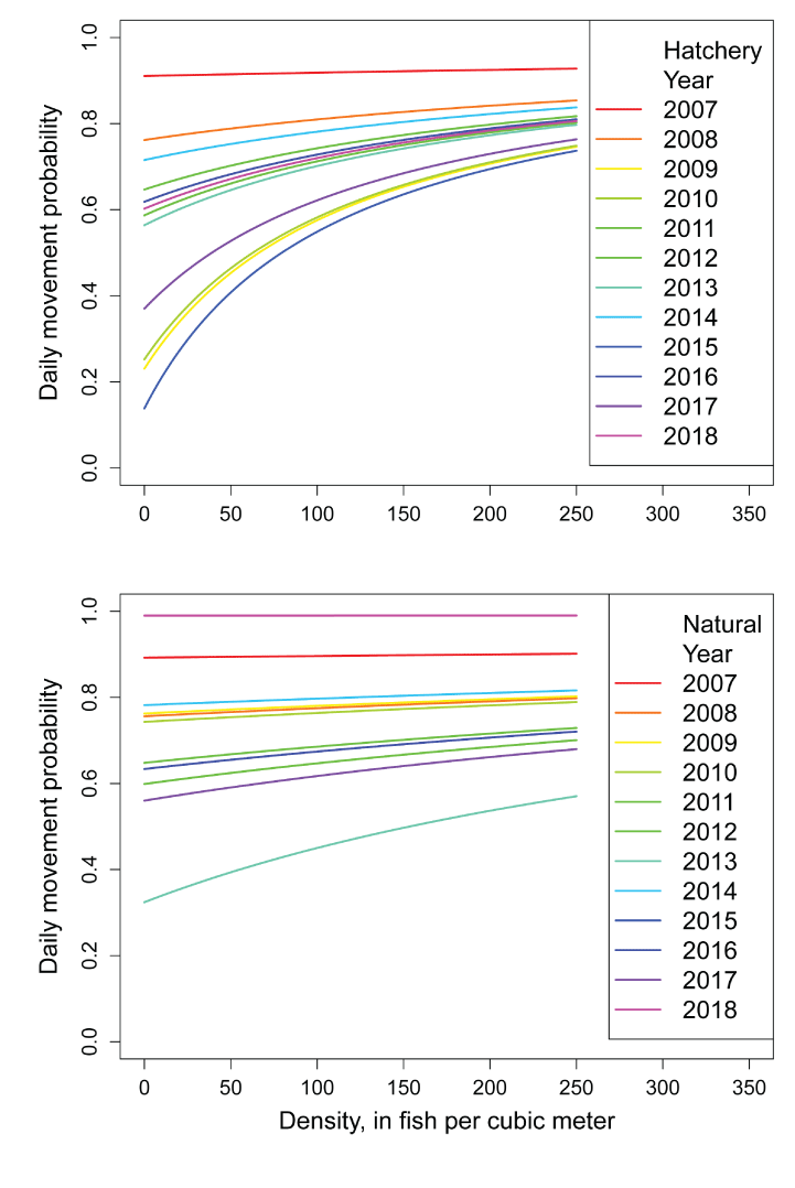 Beverton-Holt model relationships for the daily probability of moving from a habitat over a range in fish densities. Estimates are provided for hatchery (top) and natural (bottom) juvenile Chinook salmon (Oncorhynchus tshawytscha) in the restoration reach of the Trinity River, California.