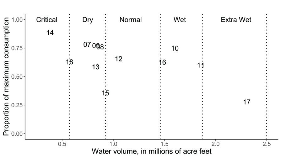 On average, the overall proportion of maximum consumption across all study years was =0.64 (SD=0.176) indicating that the assumed value of =0.66 used in past S3 calibrations and simulations was accurate. However, estimated mean annual proportions of maximum consumption were highly variable over the years ranging from Cy=0.278 to Cy=0.887. A regression of Cy on the total annual water volume discharged indicated that during critical dry conditions (for example, 2014; SD=0.099, P<0.0001; slope=-0.179, SD=0.0798, P=0.049; R2=0.33, df=10) lower consumption relative to the fish’s expected maximum consumption might be expected (table 2; fig. 8). However, this relation was largely driven by the critically dry and extremely wet years of 2014 and 2017, respectively. Thus, in wetter years natural fish were estimated to generally survive at higher rates, move less (at low fish abundance), and consume less relative to expected maximum consumption.