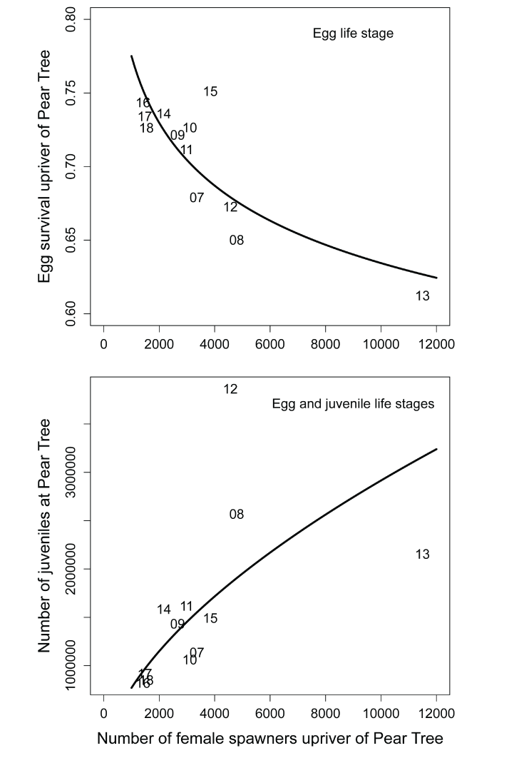 Simulated egg survival rate (top) and main stem natural production of juvenile Chinook salmon (Oncorhynchus tshawytscha) passing the Pear Tree fish trap (bottom) on the Trinity River, California as a function of the estimated number of female spawners that were used as input data for the Stream Salmonid Simulator. Data points are represented by the last two digits of each migration year and regression lines are the log-to-log relation.