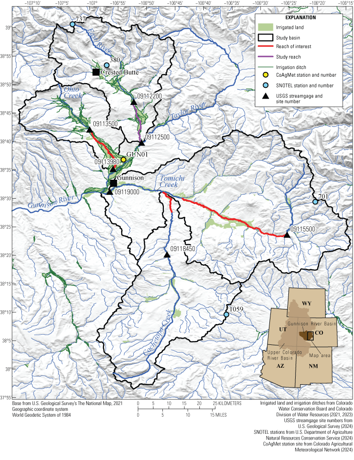 The East River, Ohio Creek, Tomichi Creek, and Cochetopa Creek (table 1) are mountainous headwater streams within the Upper Gunnison River Basin, which drains about 10,350 square kilometers of the Upper Colorado River Basin in southwestern Colorado (U.S. Geological Survey, 2019). Land cover in the Upper Gunnison River Basin is primarily characterized by evergreen forest (38.5 percent), shrub and scrubs (32.6 percent), and deciduous forest (12.0 percent; Dewitz and U.S. Geological Survey, 2021). Snowmelt is the dominant source of water, with monsoon storms also contributing high-intensity but short-lasting precipitation in the summer months (Carroll and others, 2020a). The climate in the Upper Gunnison River Basin is continental subarctic (Peel and others, 2007), with long winters followed by brief, temperate summers that support the growth of hay and other pasture grasses (Dewitz and U.S. Geological Survey, 2021). The East River, Ohio Creek, Tomichi Creek, and Cochetopa Creek provide water for irrigation (Upper Gunnison River Water Conservancy District, 2019). Canals and ditches divert water from streams (fig. 1) to pastures where it is applied using flood irrigation practices. The irrigation season is generally from May through October (Upper Gunnison River Water Conservancy District, 2019).