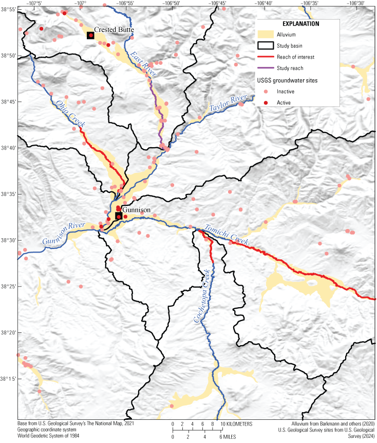 The East River Basin was designated as a Watershed Function Scientific Focus Area by the U.S. Department of Energy in 2015 to study hydrological-biogeochemical dynamics (Kakalia and others, 2021). Researchers from many organizations have contributed to data collection in the East River Basin as a community testbed (Hubbard and others, 2018; Kakalia and others, 2021). Data from sensors, cameras, surveys, continuous monitoring, and discrete samples support research on multiple topics, including snowmelt, drought, nutrients, and surface-water and groundwater interactions (Varadharajan and others, 2019; Kakalia and others, 2021). Although a large amount of information is available (Kakalia and others, 2021), the East River community testbed efforts have generally focused on the part of the basin north of Crested Butte, Colo., whereas the East River study reach and other reaches of interest for this USGS study are south of Crested Butte (fig. 1).