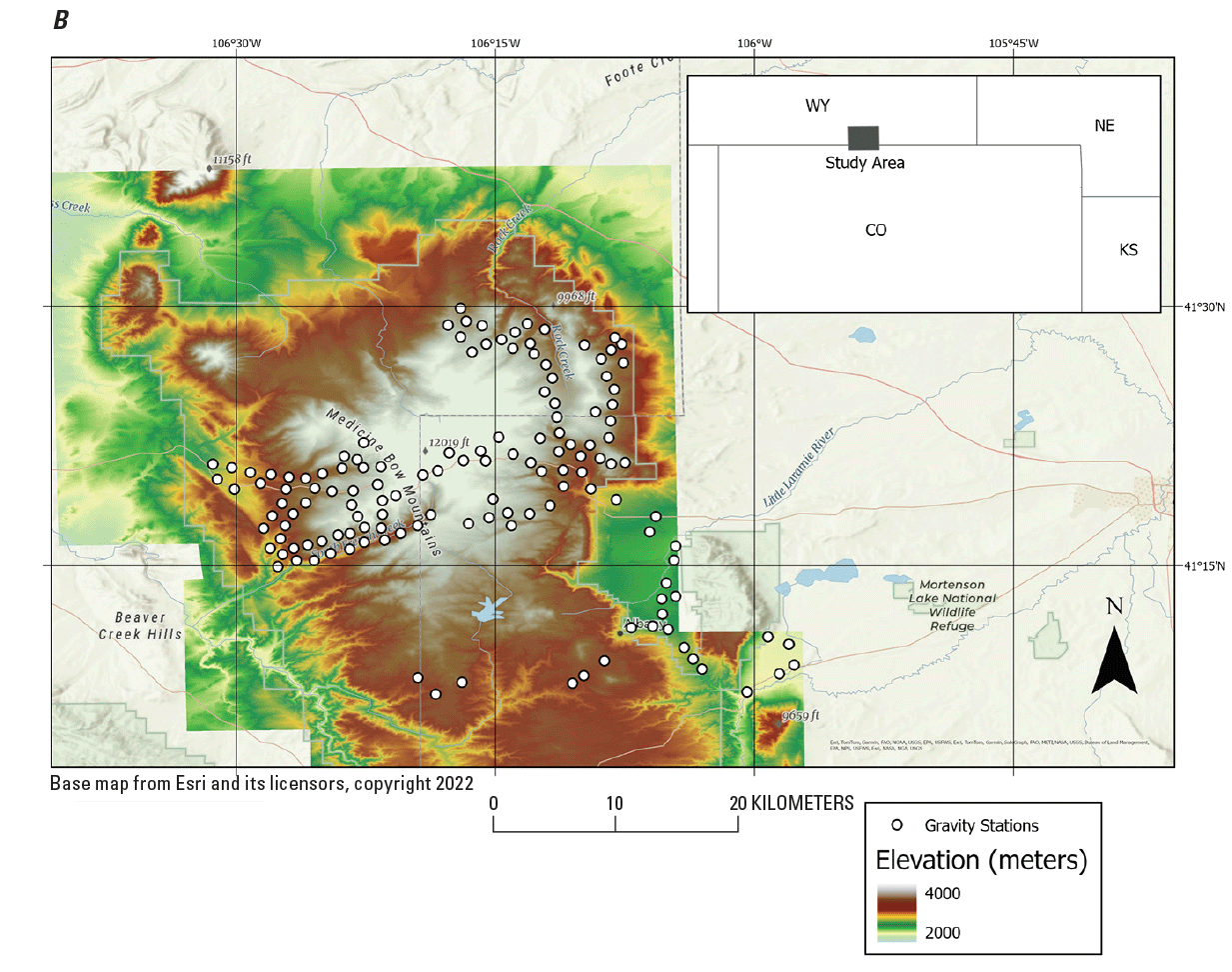 Two maps (A, B) showing the 198 gravity stations in the western United States (Wyoming and Colorado) for which location information was collected as part of regional gravity surveys. The stations overlay the mosaiced 1-meter (m) digital elevation model (DEM) rasters. Light detection and ranging (lidar) data were obtained from two sources. U.S. Geological Survey (USGS) 3D Elevation Program lidar data were retrieved from the USGS National Map Downloader (USGS, 2024). Lidar data from Merrick & Company (2016) and Quantum Spatial, Inc. (2020) were retrieved from the Colorado Hazard Mapping & Risk MAP Portal (Merrick & Company, 2016). (A) Map showing the 59 gravity stations in the Wet Mountains of Colorado (CO–WM) where location information was collected with Global Navigational Satellite System (GNSS) equipment. Elevation data are from 2,000 to 4,000 m. (B) Map showing the 139 gravity stations in the Medicine Bow Mountains of Wyoming (WY–MB) where location information was collected with GNSS equipment. Elevation data are from 2,000 to 4,000 m. The prefixes discussed here—CO–WM and WY–MB—represent the location aspect of the gravity station numbers in tables 5 and 6 (at the end of this report). ft, foot.