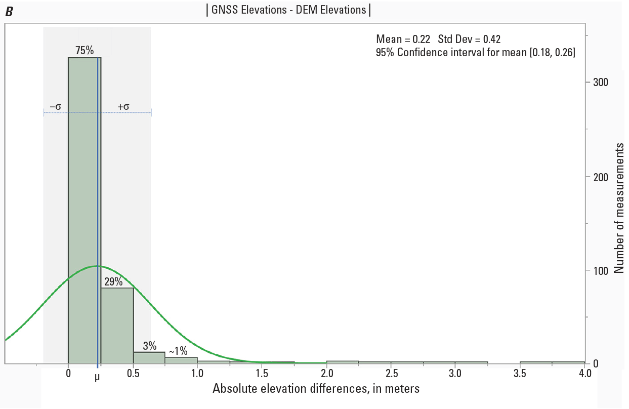 Two bar graphs (A, B) showing elevation distributions. (A) Bar graph that shows the distribution (mean = 0.13, standard deviation = 0.46) of elevation differences (global navigational satellite system–light detection and ranging [GNSS – lidar]) and indicates that 93 percent of the data fall within 1 standard deviation (σ) of the mean (μ) (13 centimeters [cm]). (B) Bar graph that shows the distribution (mean = 0.22, standard deviation = 0.42) of the absolute value of the elevation differences (|GNSS – lidar|) and a mean difference of 22 cm in the absolute differences observed within the data. %, percent; m, meter.