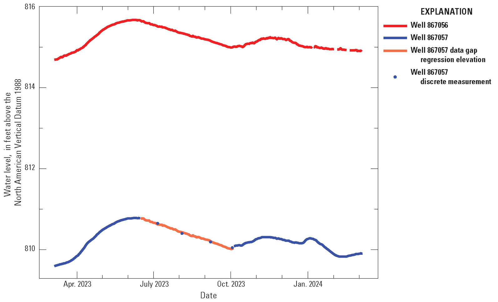 Well 867057 had a substantial data gap from June 15 to October 3, 2023 (fig. 2). To fill this data gap, a linear regression analysis was done between daily mean elevation values for wells 867057 and 867056. The hydrograph at well 867056 was most like the hydrograph at well 867057 before and after the data gap compared to all other wells in the study. The regression analysis included daily mean water elevations from wells 867056 and 867057 from March 5 to June 15, 2023, and October 4, 2023, to March 5, 2024, to fill the data gap for well 867057 for June 15 to October 4, 2024. The regression equation is listed below (eq. 1). The coefficient of determination of the equation is 0.92881798. The elevation values predicted by the regression equation were all within 0.03 of a foot of discrete water level measurements made in well 867057 during the period of lost data.