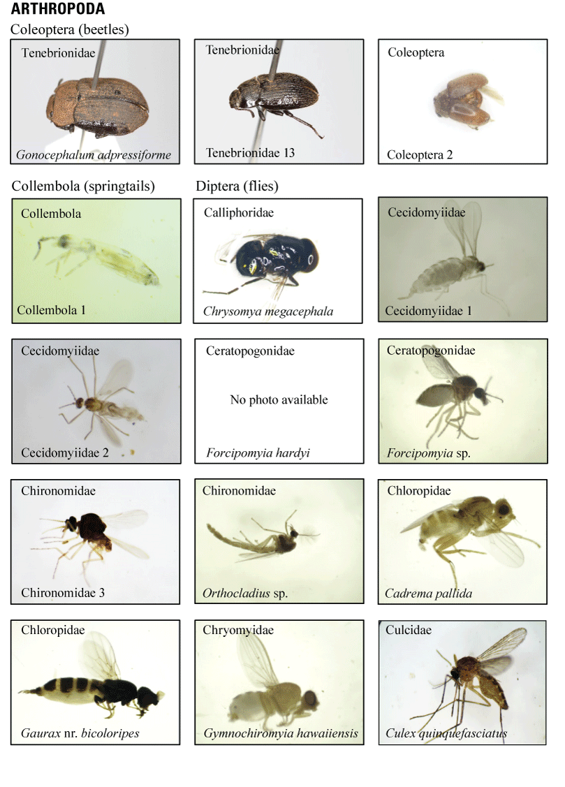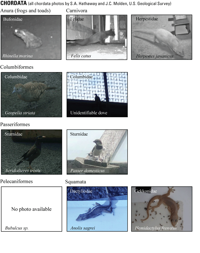 This research was funded in part by the U.S. Geological Survey Pacific Island Climate Adaptation Science Center. Logistics, research coordination, and leadership were provided by Stacie Hathaway and Robert Fisher of the U.S. Geological Survey Western Ecological Research Center. We appreciate the administrative support provided by the U.S. Geological Survey Western Ecological Research Center, San Diego and Sacramento offices. Additional administrative support was provided by the U.S. Geological Survey’s Pacific Island Ecosystems Research Center and the Hawai`i Cooperative Studies Unit at the University of Hawai`i at Hilo. We thank Pacific Air Forces Regional Support Center for supporting this project, particularly Kristen Rex and Joel Helm, who provided background and encouragement for the project. Access, transport, and accommodations were provided by the U.S. Air Force (USAF) and facilitated by Kristen Rex. At the time of publication, data for many projects were not available from USAF. Data from this project are available from James Stanford (USAF) upon reasonable request. We thank Naval Facilities Engineering Systems Command and Naval Supply Systems Command Fleet Logistics Center Pearl Harbor for facilities access and cooperation with our inspections at Joint Base Pearl Harbor–Hickam. We thank Captain Bleha (Detachment 1, Pacific Air Forces Regional Support Center) for providing atoll-wide access and general support at Wake Atoll. We thank Chugach Federal Solutions, Inc., teams, especially the temporary Base Operating Support Environmental Technician, Bryan, for sharing his experience and dedication to implementing biosecurity at Wake. We would like to express appreciation for the mess hall, fire department, lodging, logistical, and additional staff that provided for our nourishment, safety, accommodations, and general well-being. And thank you to all others who graciously allowed our surveys to take place in their workspace. We thank Carlton Rochester for assistance with data management, Cindy Hitchcock for assistance with graphics and formatting, and Neil Evenhuis for assistance with species identifications. We thank Leyla Kaufman, Helen Sofaer, and Diane Elam for their thoughtful reviews and helpful comments on this report. Finally, this project would not have been possible without the close and enjoyable collaboration of the survey team, which included authors Stacie Hathaway (U.S. Geological Survey), James Molden (U.S. Fish and Wildlife Service), and Kristen Rex (National Oceanic and Atmospheric Administration). All animal procedures were reviewed and approved by the U.S. Geological Survey’s Western Ecological Research Center via the University of California, Davis’s Institutional Animal Care and Use Committee review process.