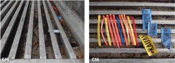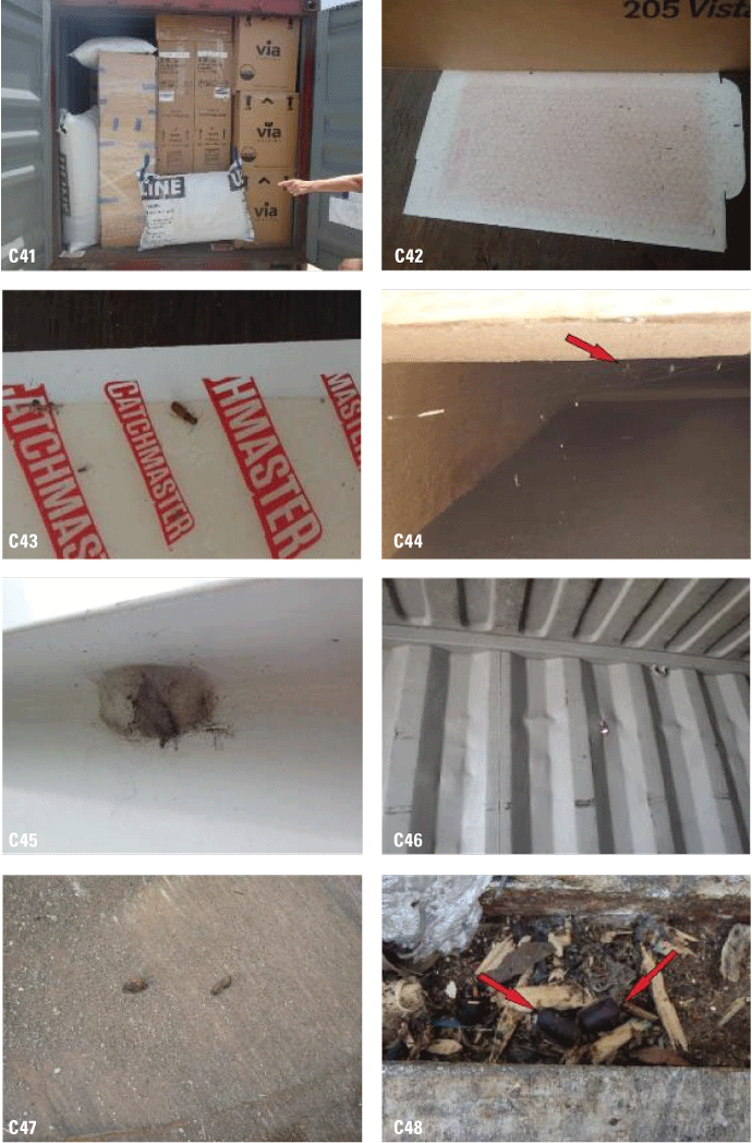 A photograph representing each container inspected (C01–C50) is included: (C01) A failing patch on container ceiling. (C02) Hole in container side stuffed with a wet shipping invoice. (C03) Holes rusted through container door. (C04) Wood damage on container floor. (C05) Gap in container door seal. (C06) Gap in container floor. (C07) Buckled container ceiling. (C08) Gap in container floor with peeling caulk and missing floor bolt. (C09) Warping of container floor and missing floor bolt. (C10) Holes rusted through container ceiling. (C11) Damage to container floor and buckled container wall. (C12) Buckled container wall. (C13) Buckled container wall. (C14) Buckled container ceiling. (C15) Hole in container wall. (C16) Hole rusted through container ceiling. (C17) Hole between damaged container floor and container wall patched with duct tape. (C18) Hole through container door. (C19) Gap in container floor. (C20) Damaged container door seal patched with duct tape. (C21) Hole in container door. (C22) Crack in container door seal. (C23) Container door missing bolt. (C24) Gap in container floor with peeling duct tape. (C25) Damaged container door seal. (C26) Gap in container floor. (C27) Holes in container ceiling. (C28) Buckled container wall. (C29) Gap in container door. (C30) Hole rusted through container door. (C31) Fuel truck chassis with spider in web. (C32) Flat racks with loose rust and debris on deck. (C33) Holes rusted through flat rack deck. (C34) Layer of dirt (or soil) and debris on flat rack deck. (C35) Holes rusted through flat rack deck. (C36) Flat rack deck which harbored seeds and cobwebs. (C37) Debris on flat rack deck. (C38) Hole rusted through flat rack deck under approximately 2.5 centimeters loose rust and debris. (C39) A flat rack in relatively good condition. (C40) Mower deck secured with old lumber on flat rack. (C41) A Missile Defense Agency (MDA) container on Wake with two glue boards and a desiccant packet but no rodent bait station or pest strip visible. (C42) An MDA container on Wake with the glue board not set (protective film still attached). (C43) Insects captured on an MDA container glue board. (C44) A spider living within an MDA container pallet. (C45) A jumping spider (Salticidae family) within silk shelter on the hazardous materials container. (C46) Hole and buckling in container wall. (C47) Animal droppings in a Chugach container on Wake designated to go back to Hawai`i. (C48) Dirt (or soil) and debris build up on reefer floor, including Periplaneta sp. (cockroach) oothecae (egg masses within a protective covering). (C49) Dirt (or soil) and debris build up on reefer floor. (C50) Shipment seals and tags observed within reefer indicated at least 12 movements to 3 or more islands (Kaua`i, Molokai, and O`ahu) without being cleaned before it was sent to Wake Atoll. All photographs by Stacie A. Hathaway, U.S. Geological Survey.