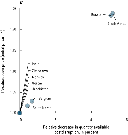 Displayed as a scatter plot, figure 1B illustrates the postdisruption prices and net disruption levels for all palladium scenarios (defined by the complete restriction of U.S. net imports of palladium from nine producers from which the United States was a direct or indirect net importer: Belgium, India, Norway, Russia, Serbia, South Africa, South Korea, Uzbekistan, and Zimbabwe). The results for South African and Russian scenarios were of similar magnitude, which is to be expected given that both countries produced and net exported to the United States roughly the same amount of palladium in 2023. The availability of Russian palladium helped to mitigate the effects of a South African disruption just as the availability of South African palladium helped to mitigate the effects of a Russian disruption. A scenario in which South Africa and Russia disrupted palladium trade simultaneously was not modeled but would have undoubtedly resulted in a markedly higher disruption level and price given the lack of substantial production outside of these two countries. In contrast, disruption scenarios for Belgium and South Korea, both of which refined and recycled but did not mine palladium, resulted in markedly lower net disruption levels and price increases. These smaller decreases correspond to not only lower U.S. net imports from these countries but also a larger quantity of palladium available from other countries, mainly Russia and South Africa. The impacts from the remaining five scenarios (India, Norway, Serbia, Uzbekistan, and Zimbabwe) were even less pronounced, with extremely low net disruption levels and price increases, primarily due to their markedly smaller contributions to U.S. net imports of palladium and the availability of palladium from major producers like Russia and South Africa. Scenarios from other palladium producers (for example, Canada) were excluded from the analysis because the United States was a net exporter of palladium to those producers in 2023.
