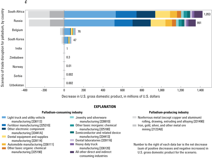 Results from the economic impacts modeling for all nine palladium scenarios by industry are displayed in figure 1C. Specifically, this part of the figure displays the modeled effects on U.S. GDP for 11 palladium-consuming industries that contributed the most to the decreases along with increases to U.S. GDP from 2 palladium-producing industries (mining and recycling) and an “all other industries” category that reflects the aggregate effect on the remaining 389 industries, which includes several additional industries that were direct consumers of palladium. All changes in U.S. GDP are presented in current (2023) U.S. dollars. Scenarios of Russian and South African palladium trade disruptions resulted in the largest net decreases in U.S. GDP (displayed in the data labels of each scenario in figure 1C) of approximately $1 billion each, whereas the scenarios for Belgium and South Korea both resulted in net decreases of less than $100 million and those from the five other scenarios resulted in net decreases of $1 million or less. Although the specific industry contributions to the decreases varied by scenario, the industries that contributed the most overall were the “Light truck and utility vehicle manufacturing [336112]” industry, where palladium is used in catalytic converters; the “Fertilizer manufacturing [325310]” industry, where palladium is used as a catchment gauze in nitric acid production; and the “Other electronic components manufacturing [33441A]” industry, where palladium is used in multilayer ceramic capacitors. The other industries affected reflect palladium’s use in dental alloys, hybrid integrated circuits, jewelry, catalytic converters for other vehicle classes, and catalysts for other chemical industries. In these scenarios of foreign supply disruptions, palladium-producing industries (under BEA industry code 2122A0 for mining and 331490 for recycling) garnered higher palladium prices and increased their palladium production, thereby increasing their positive contribution to U.S. GDP, which reduced the net effect of the trade disruptions on the economy overall.